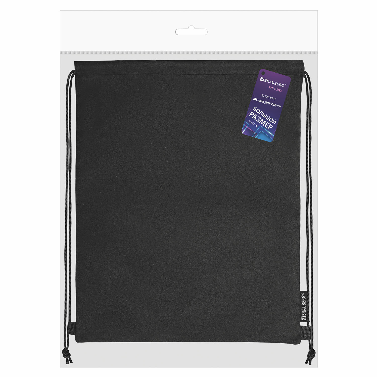 Мешок упакован в плотный ПЭТ пакет с европодвесом, который сохранит качество и товарный вид при хранении и транспортировке. Мешок для обуви BRAUBERG большой удобный с ручкой, 51х41 см, "Total Black", 273454