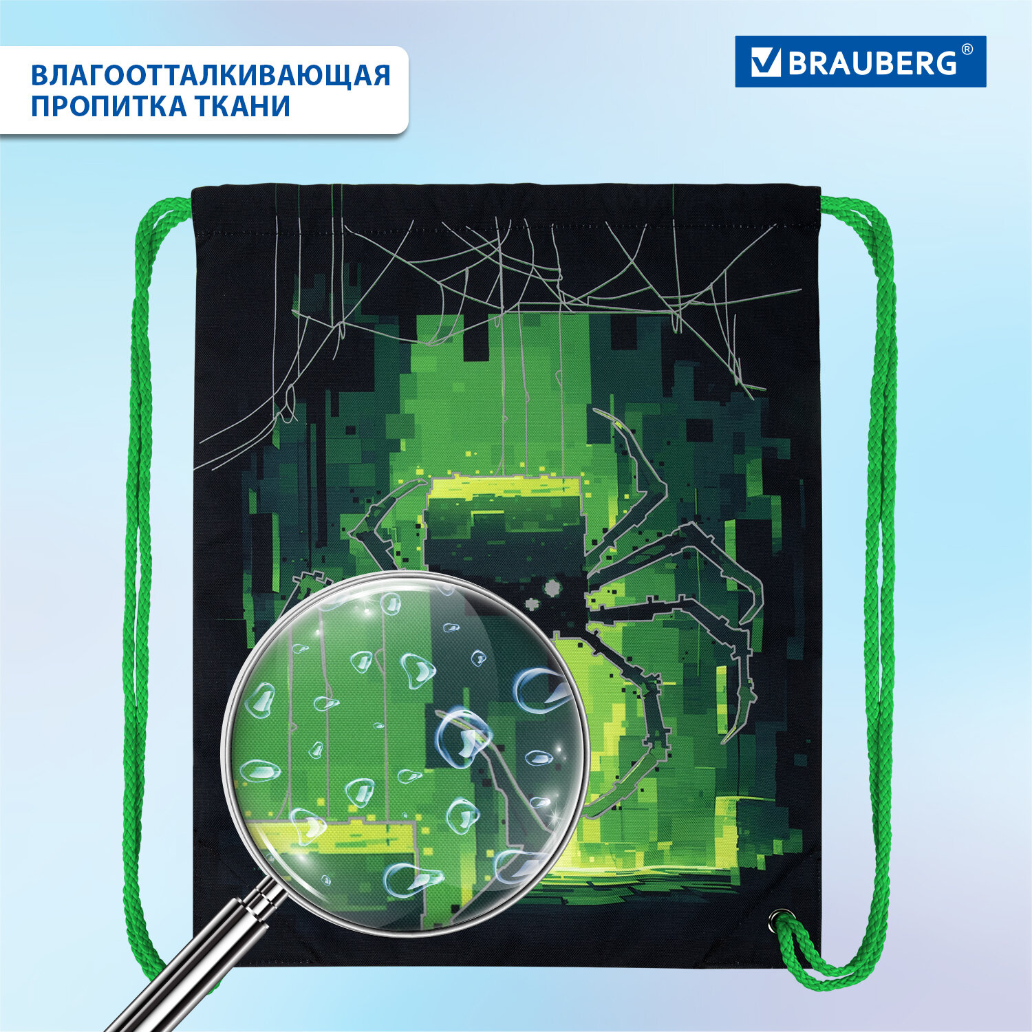 - Мешок для обуви BRAUBERG PREMIUM, карман, подкладка, светоотражайка, 43х33 см, "Digital spider", 273444