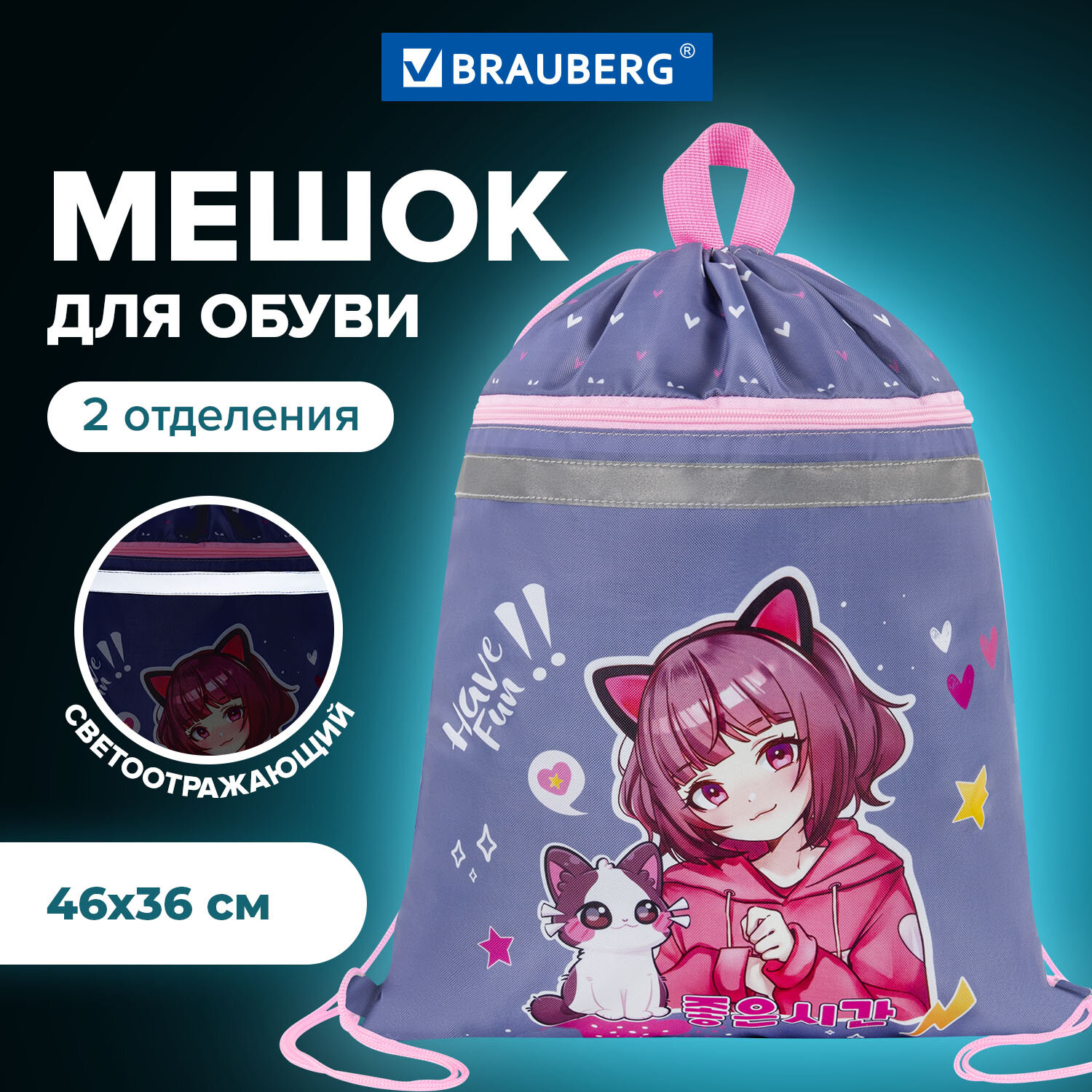 - Мешок для обуви BRAUBERG, с петлей, светоотражающая полоса, 2 отделения, 46х36 см, Anime friends, 272398