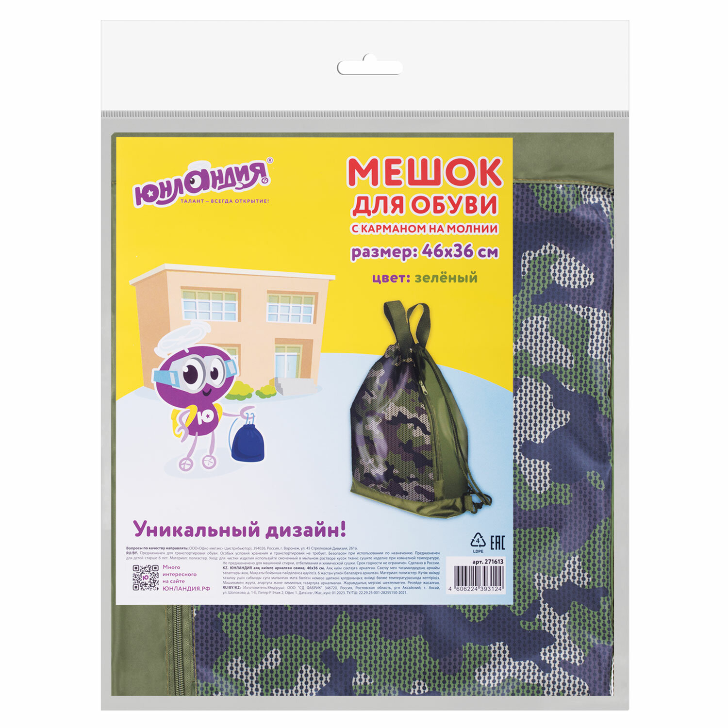- Мешок для обуви ЮНЛАНДИЯ, с ручками, боковой карман на молнии, 46х36 см, "Camo Mode", 271613