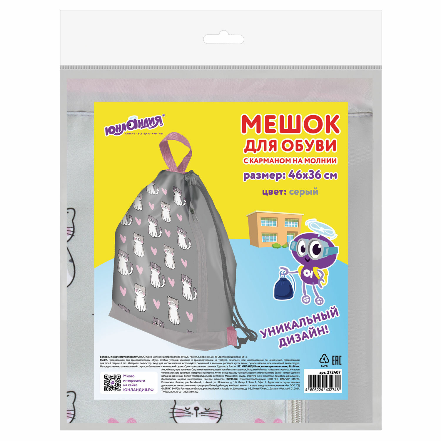 - Мешок для обуви ЮНЛАНДИЯ с ручками, боковой карман на молнии, 46х36 см, "Kitties", 272407