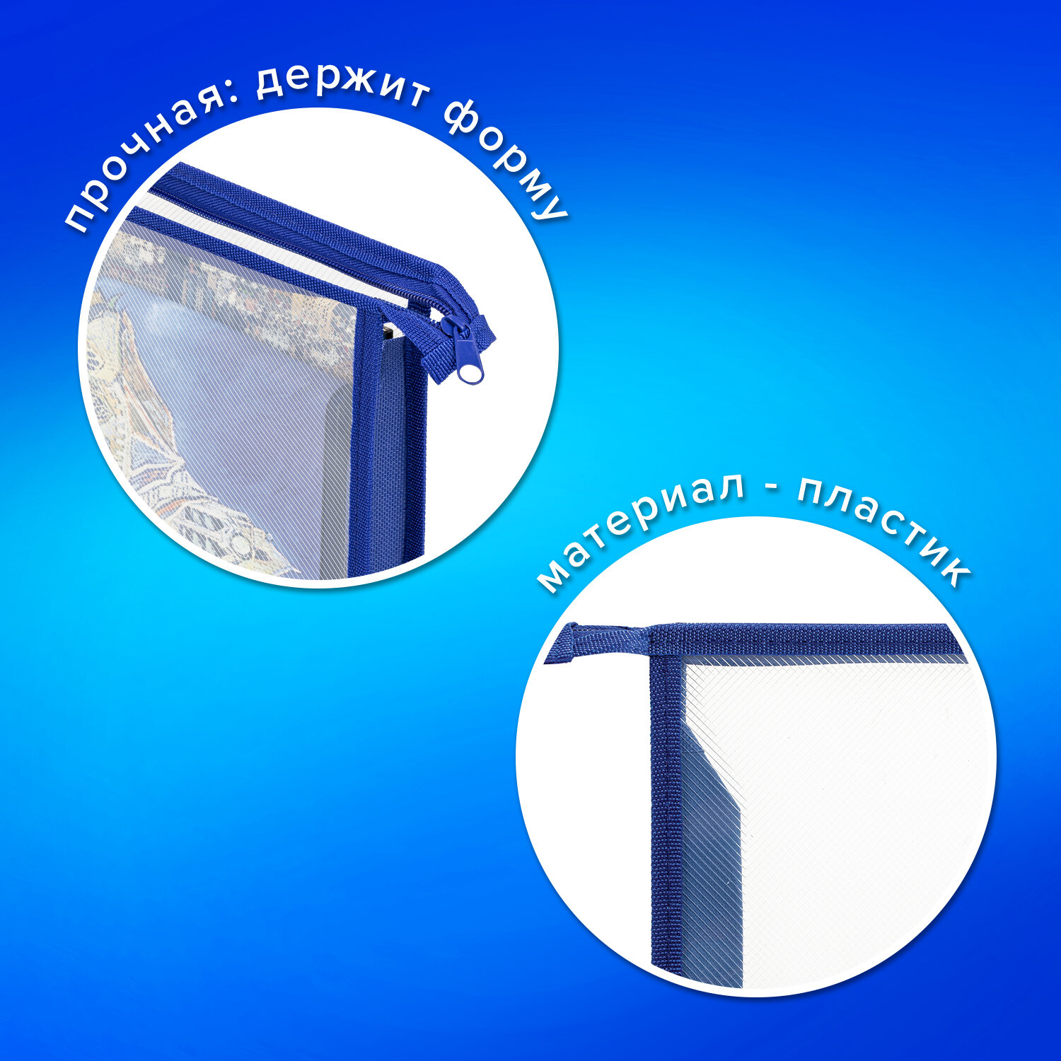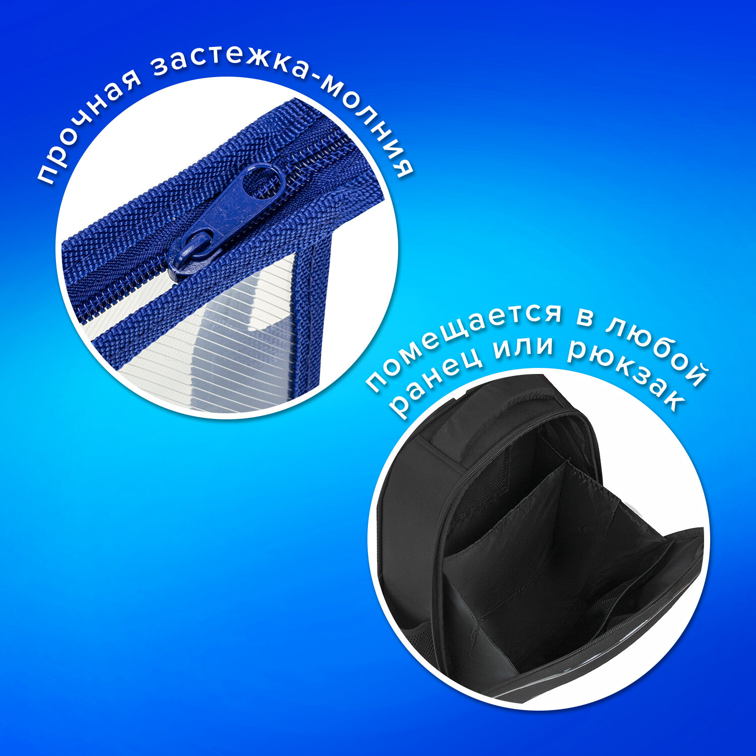 По бокам и внизу находится вставка из прочного полиэстера, которая позволяет увеличить объем папки. Папка для тетрадей ПИФАГОР А5, пластик, молния сверху, прозрачная, синий, 272115