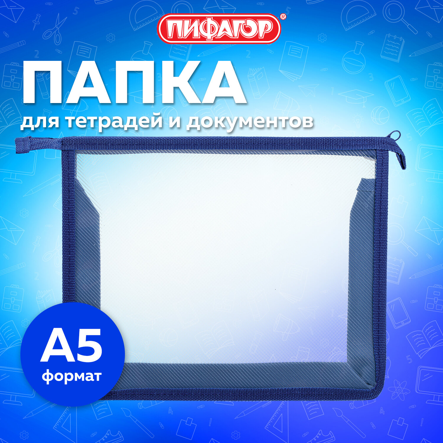 - Папка для тетрадей ПИФАГОР А5, пластик, молния сверху, прозрачная, синий, 272115