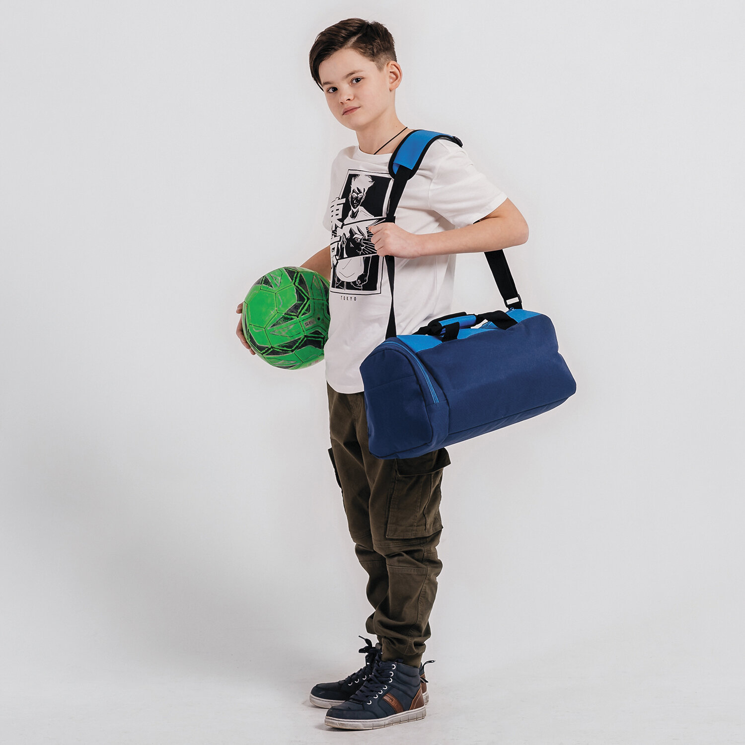 Вместительная спортивная школьная сумка с отделением для обуви выполнена из прочного полиэстера. Качественный водоотталкивающий материал не позволяет грязи въедаться, поэтому сумку легко чистить влажной тряпочкой.