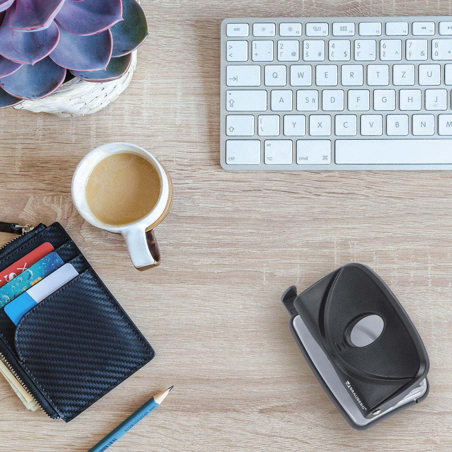 Дырокол эргономичного дизайна пробивает до 20 листов бумаги. Благодаря качественным пробойникам обеспечивает легкое и точное пробивание бумаги. Количество пробиваемых отверстий - 2, диаметр каждого - 6 мм, расстояние между отверстиями - 8 мм. Метка центрирования поможет ровно разместить листы, а ограничительная линейка - пробить отверстия в нужных местах. Благодаря текстурной поверхности дырокола руки не скользят во время работы. Оснащен контейнером для сбора мусора, а также блокиратором для компактного хранения. Классический черный цвет отлично впишется в любой интерьер. Дырокол BRAUBERG "Original", до 20 листов, черный, 222539