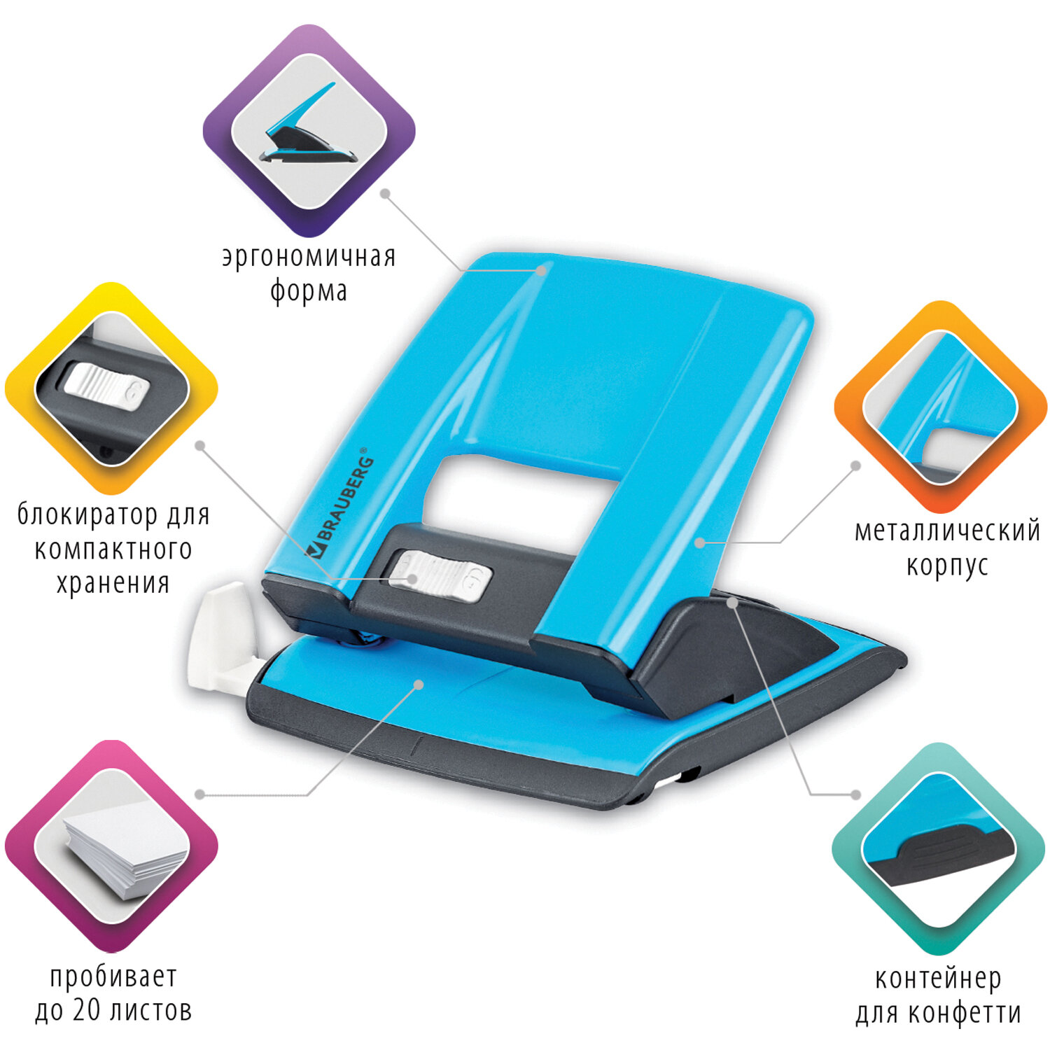 - Дырокол металлический BRAUBERG "ULTRA", до 20 листов, голубой, 228759