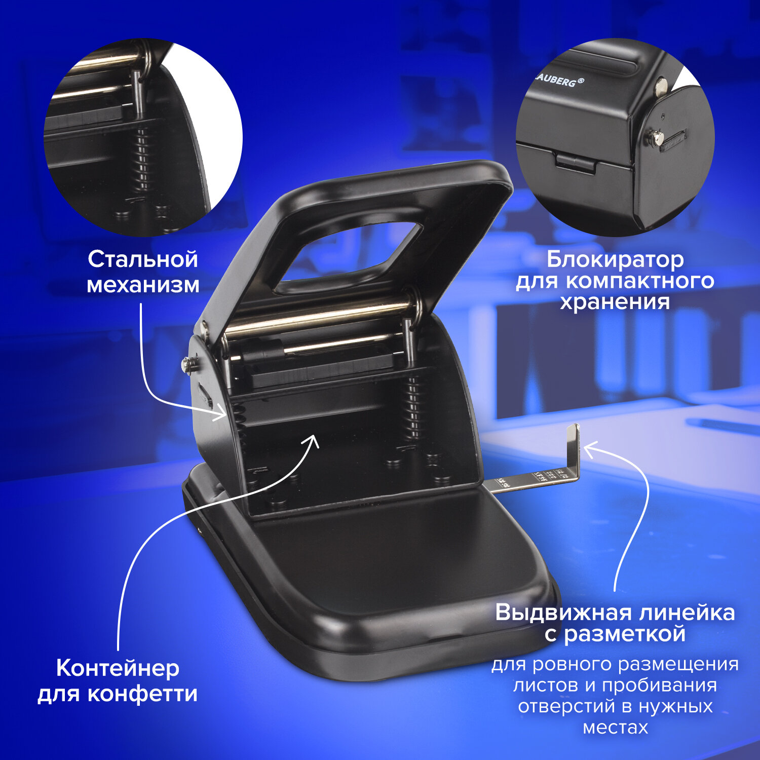 Мощный дырокол BRAUBERG t;Heavy dutyt; пробивает до 60 л. бумаги. Благодаря качественным пробойникам обеспечивает легкое и точное пробивание бумаги. Количество пробиваемых отверстий – 2, диаметр каждого – 6 мм, расстояние между отверстиями – 8 мм. Метка центрирования поможет ровно разместить листы, а ограничительная линейка – пробить отверстия в нужных местах. Оснащен контейнером для сбора мусора и блокиратором для компактного хранения. Дырокол металлический МОЩНЫЙ BRAUBERG "Heavy duty", до 60 л., черный, 226868