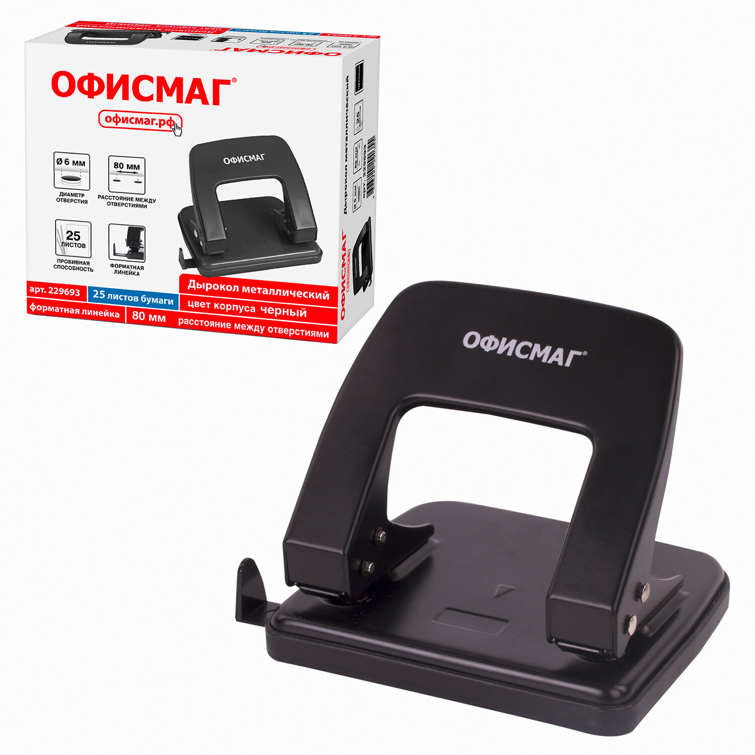 - Дырокол металлический ОФИСМАГ, до 25 листов, черный, 229693