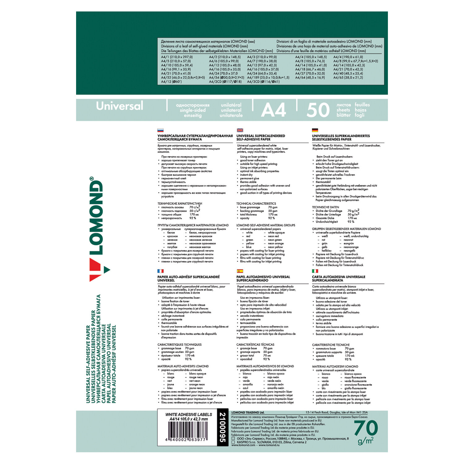 - Этикетка самоклеящаяся 105х42,3 мм, 14 этикеток, белая, 70 г/м2, 50 листов, LOMOND, 2100095