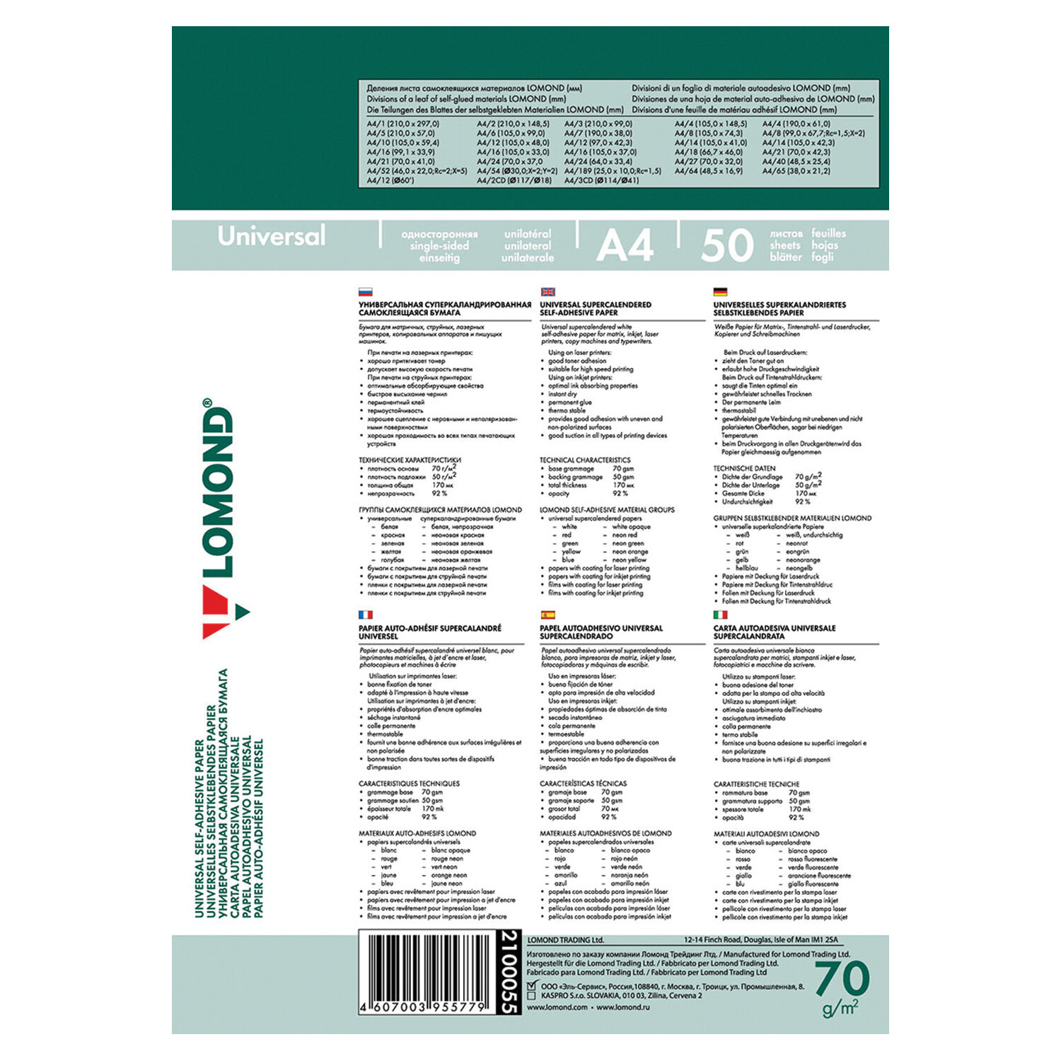 Этикетка самоклеящаяся 105х59,4 мм, 10 этикеток, белая, 70 г/м2, 50 листов, LOMOND, 2100055