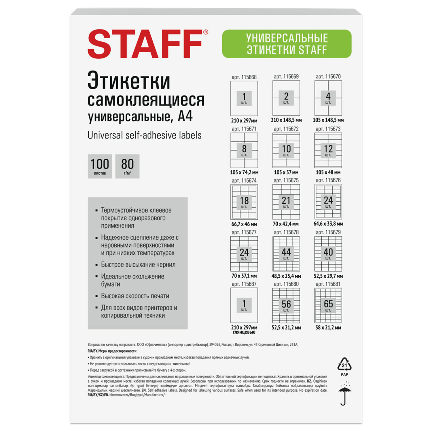 Изготовлены из самоклеящейся глянцевой бумаги плотностью 80 г/м2. Надежно приклеиваются к поверхности любой формы и материала. Картонная упаковка содержит 100 листов формата А4, на каждом листе – одна этикетка размером 210х297 мм. Этикетка самоклеящаяся ГЛЯНЦЕВАЯ 210х297 мм, 1 этикетка, белая, 80 г/м2, 100 л., STAFF BASIC, 115687