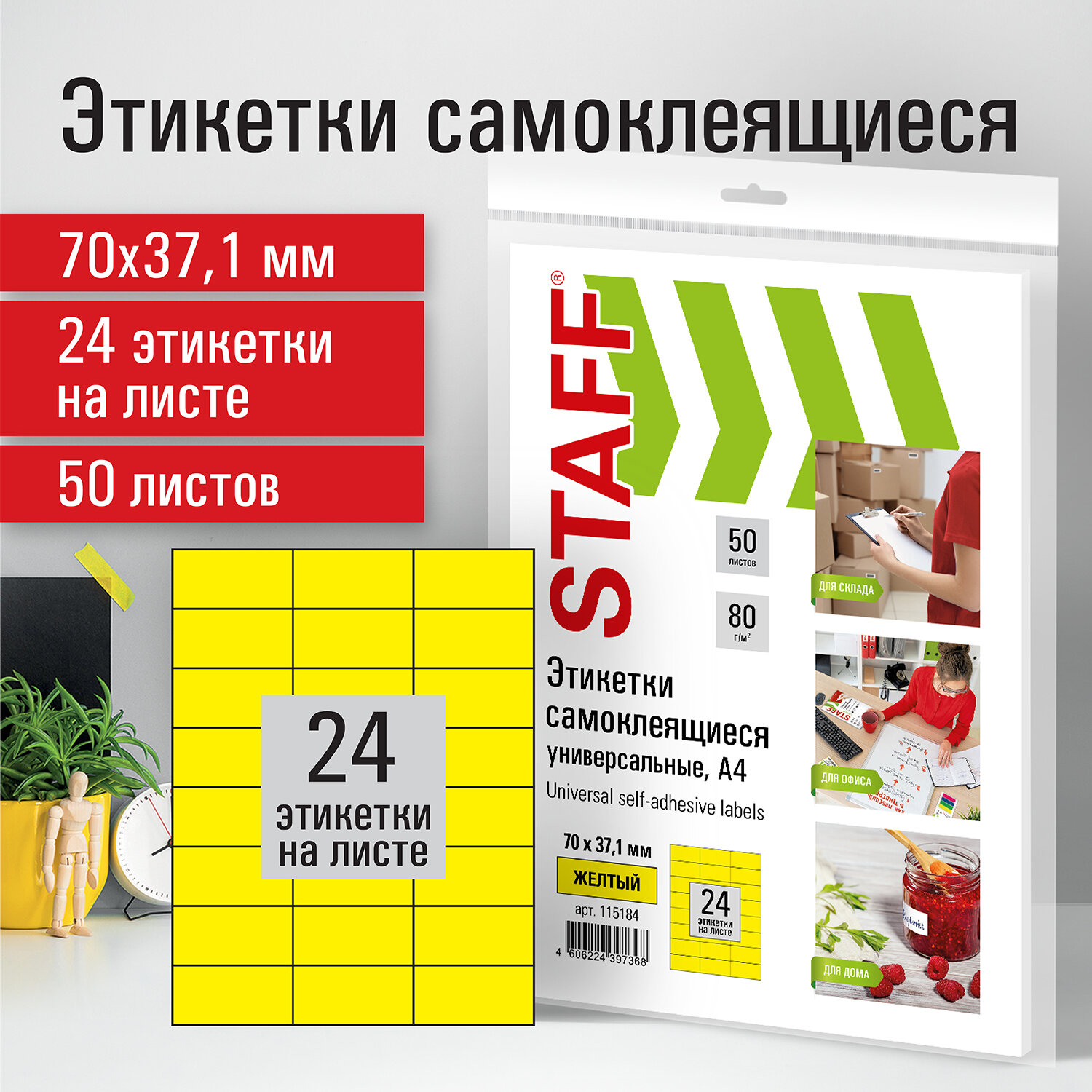 - Этикетка самоклеящаяся 70х37,1 мм, 24 этикетки, желтая, 80 г/м2, 50 листов, STAFF, 115184