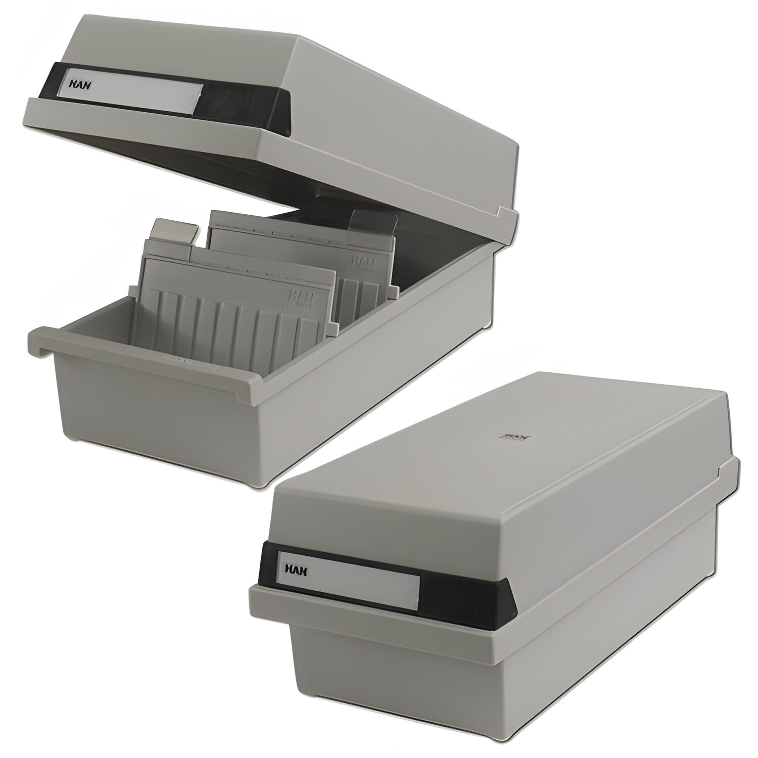 - Картотека пластиковая ФОРМАТ А6 (148х105 мм) горизонтальная на 1300 карт, с крышкой, серая, HAN (Германия), НА956/11