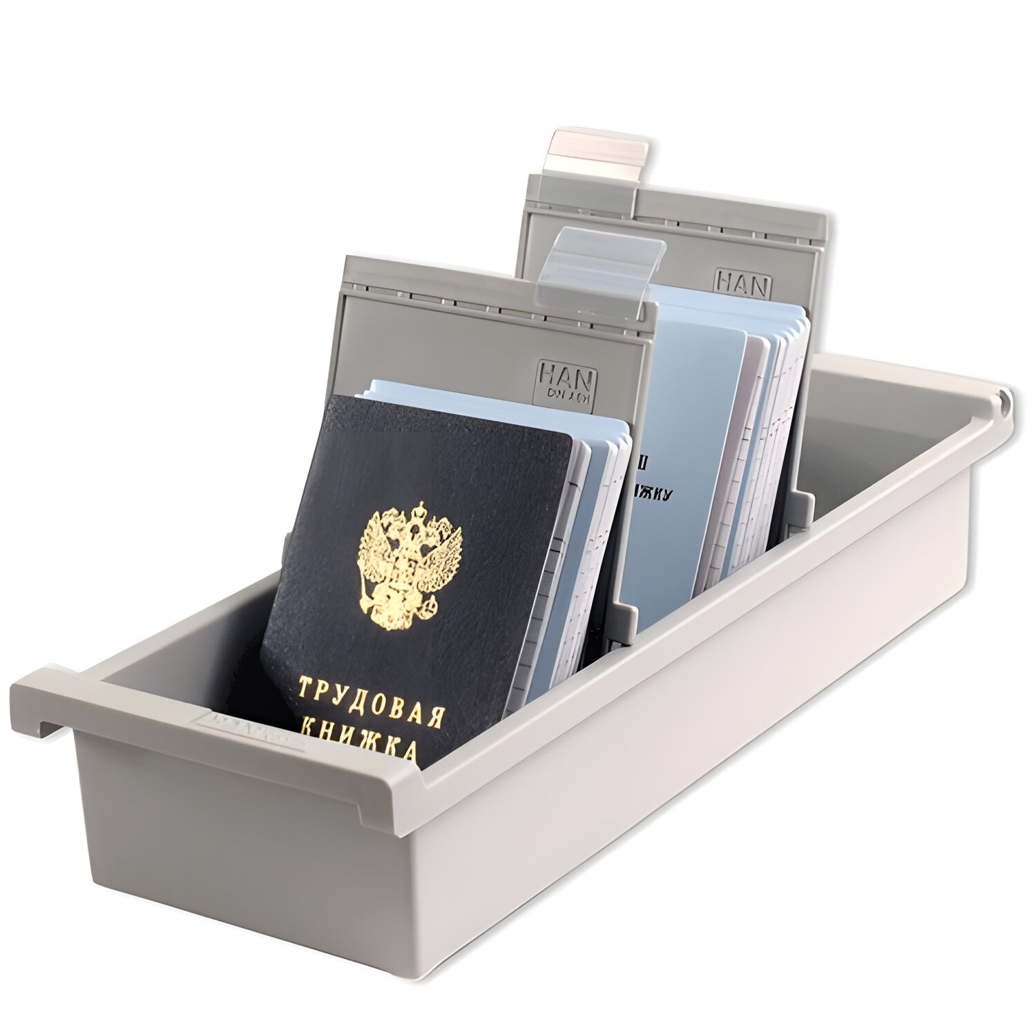 Вертикальная открытая перекидная картотека для систематизации и хранения карточек. Рекомендуем для хранения трудовых книжек. Картотека пластиковая ФОРМАТ А6 (148х105 мм) вертикальная на 1300 карт, серая, HAN (Германия), НА956/0/1/11