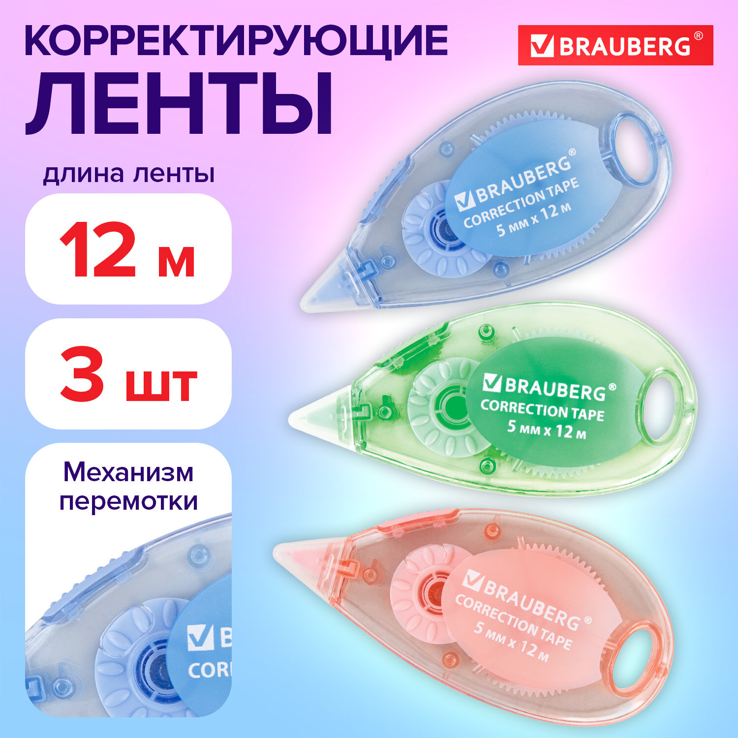 - Корректирующая лента BRAUBERG PASTEL, 5 мм x 12 м, механизм перемотки, ВЫГОДНАЯ УПАКОВКА 3 штуки в блистере, 271252