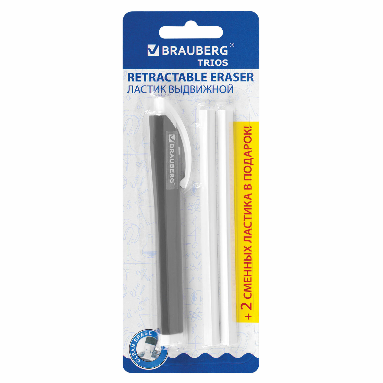 Ластик BRAUBERG t;TRIOSt; подходит для использования дома, в офисе, во время зарисовок на природе и в поездках. Это незаменимая вещь для школьника и студента. Ластик выдвижной + 2 сменных ластика BRAUBERG "TRIOS", 124х12х12 мм, графитовый корпус, 272692