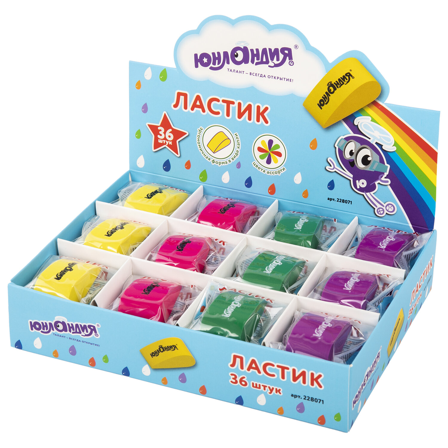 Эргономичный ластик имеет форму капли и поставляется в ярких цветах ассорти. Размер - 38х22х16 мм. Поставляется в картонном дисплее. Ластик ЮНЛАНДИЯ "Капля", 38х22х16 мм, цвет ассорти, 228071