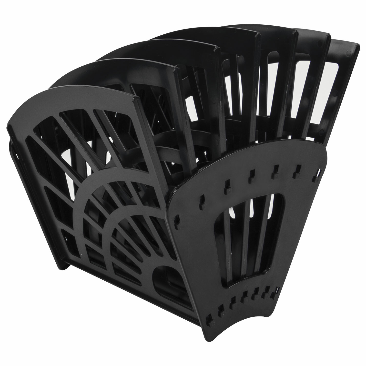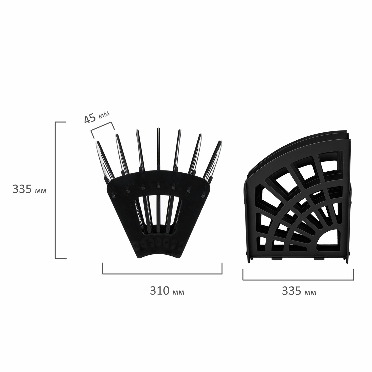 Изготовлен из пластика черного цвета. Размер собранного лотка с 6 отделениями - 335х335х310 мм. Имеет вертикальное и горизонтальное расположение. Упакован в термоусадочную пленку, поставляется в компактном разобранном виде. Лоток для бумаг веерный STAFF 7-ми секционный, 6 отделений, сетчатый, черный, 237023