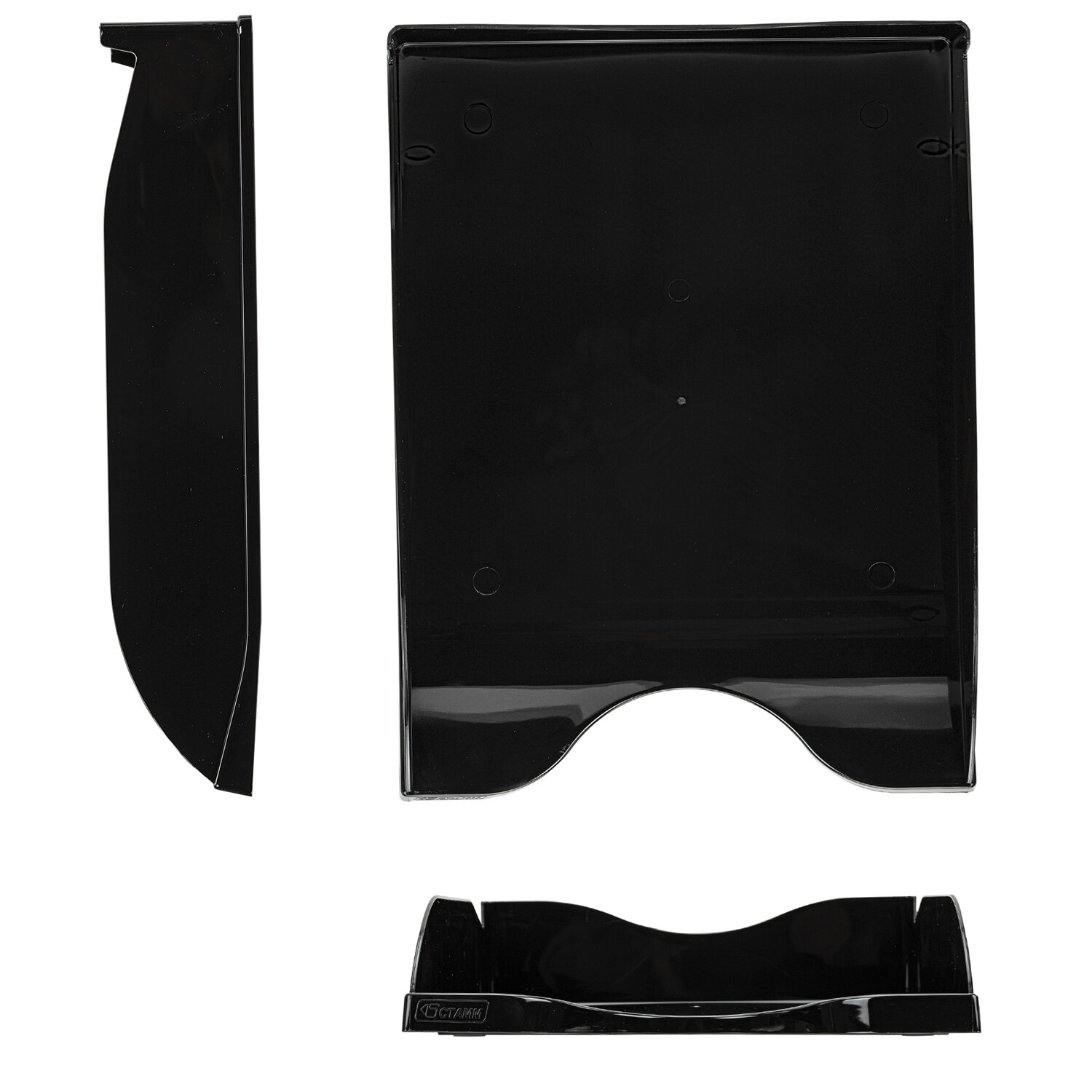 1 отделение. Имеет фиксаторы, препятствующие соскальзыванию с нижнего лотка. Изготовлен из пластика черного цвета с гладкой глянцевой поверхностью. Размер (ВxШхГ) - 65x255х340 мм. Удобная транспортировка и хранение за счет укладки лотков один в другой. Лоток горизонтальный для бумаг "Люкс", А4 (350х255х65 мм), полипропилен, черный, ЛТГ-30866