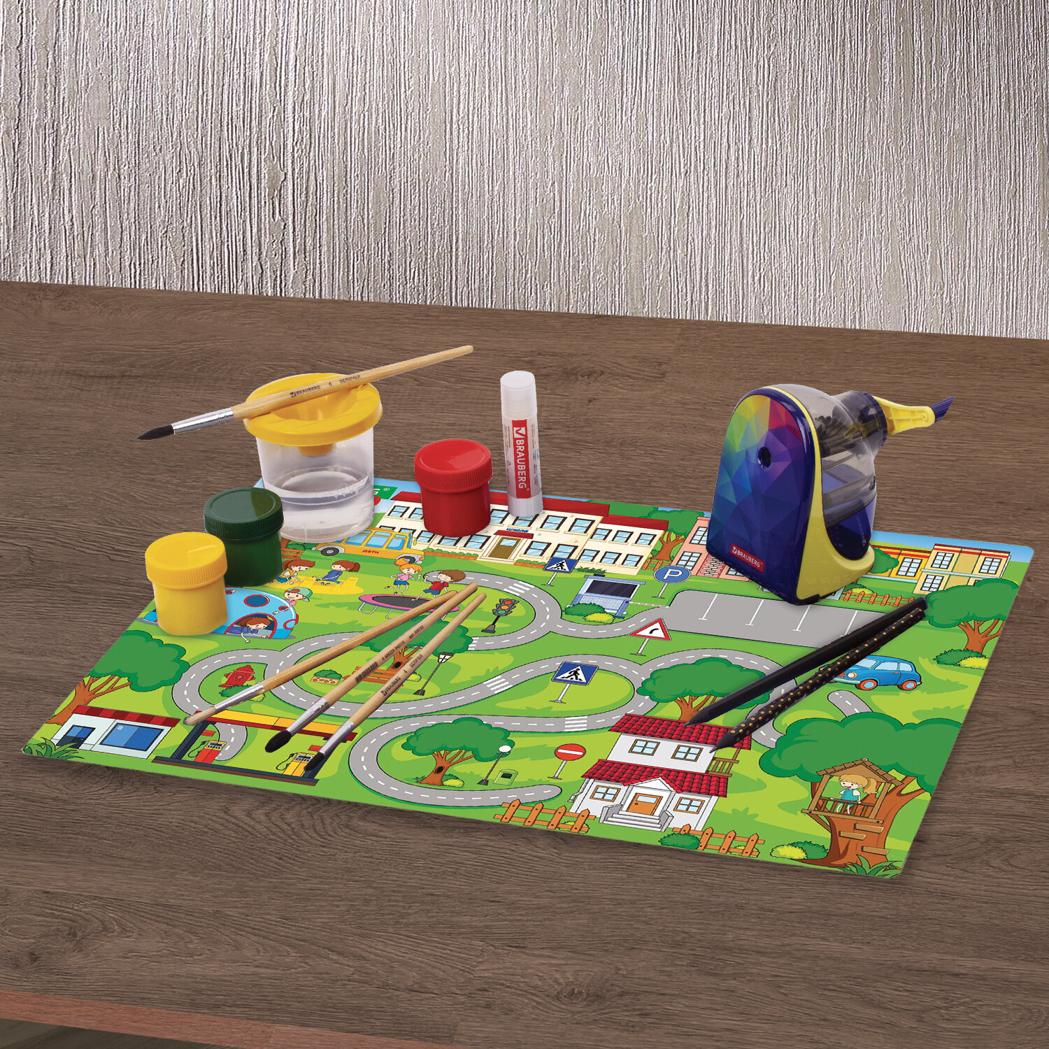 Настольное покрытие не скользит и не деформируется во время работы. Практичная прямоугольная форма и увеличенный размер формата А3+ (46х33 см) позволяют полностью закрыть рабочую поверхность, используемую для творчества. Настольное покрытие BRAUBERG KIDS, А3+, пластик, 46x33 см, "Лабиринт", 273620