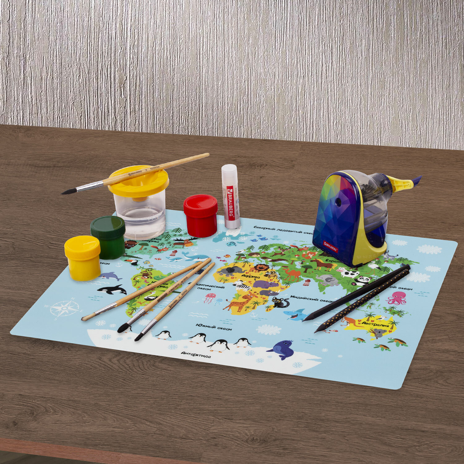 Настольное покрытие не съезжает и не деформируется при работе. Практичная прямоугольная форма и увеличенный размер 46х33 см позволяют закрыть всю необходимую рабочую поверхность. Настольное покрытие ЮНЛАНДИЯ, А3+, пластик, 46x33 см, "Map", 272370