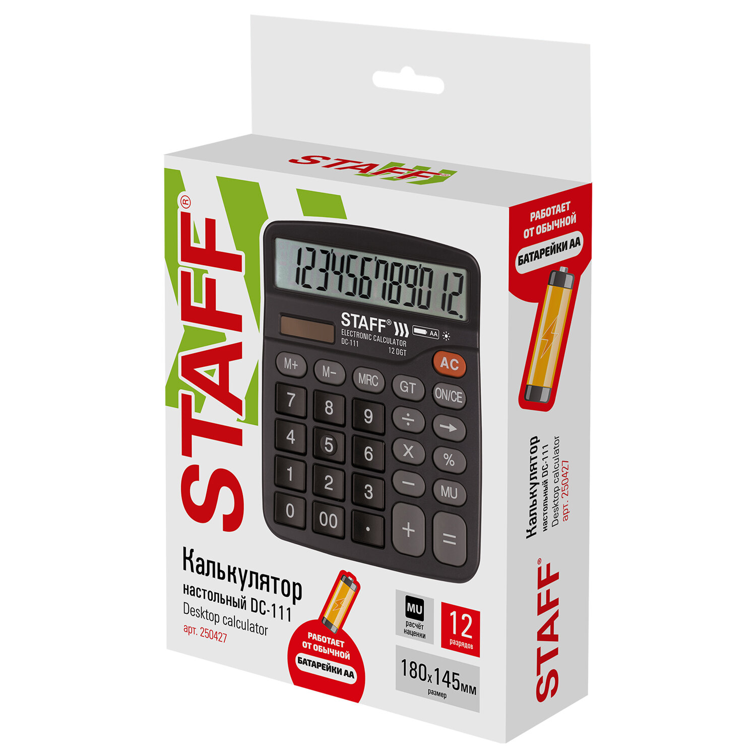 - Калькулятор настольный STAFF PLUS DC-111 (180x145 мм), 12 разрядов, двойное питание, +БАТАРЕЙКА АА, 250427