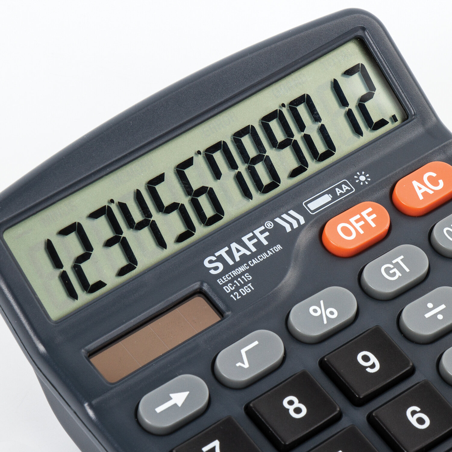 - Калькулятор настольный STAFF PLUS DC-111S, КОМПАКТНЫЙ (150x120 мм), 12 разрядов, двойное питание, + БАТАРЕЙКА АА, 250428