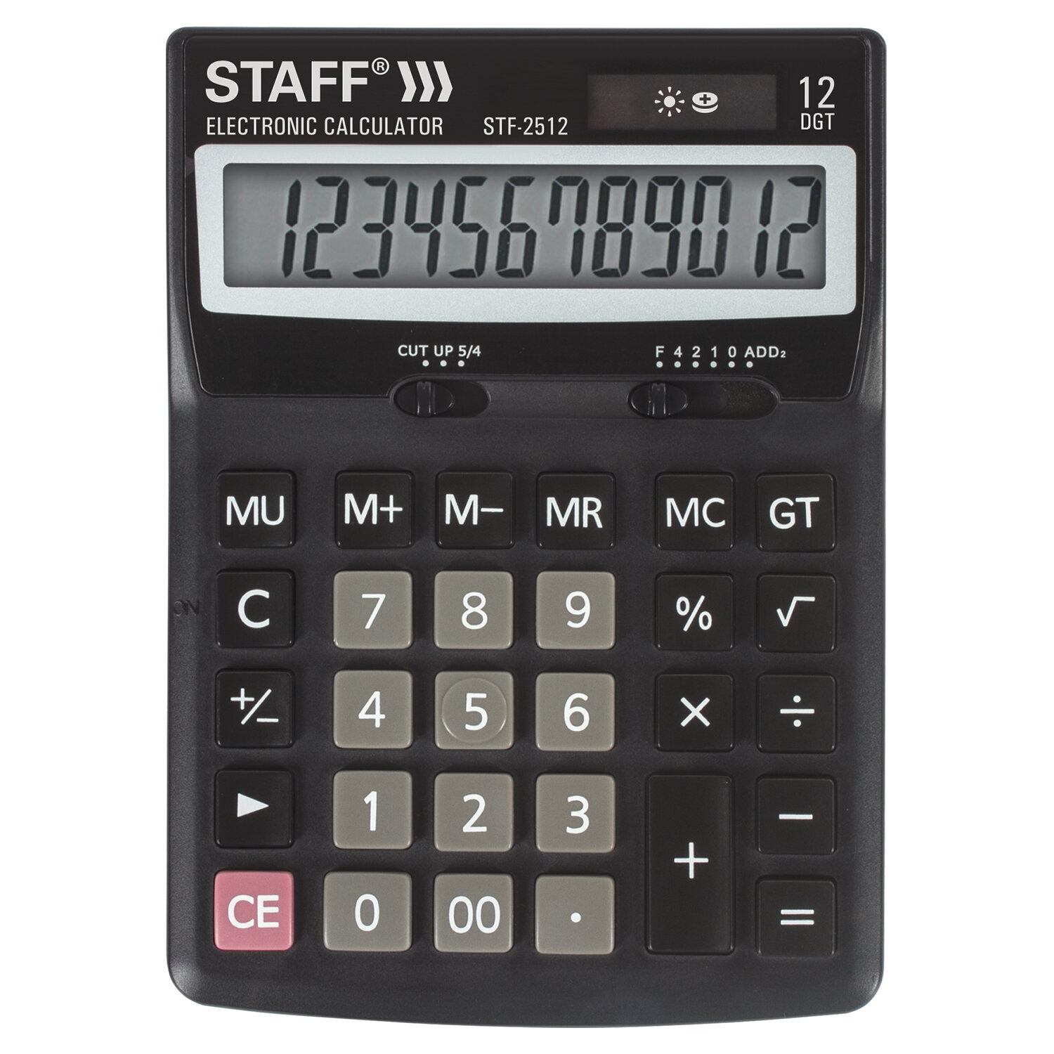 Калькулятор производит все основные арифметические действия, вычисления с памятью, вычисления с процентами, извлечение квадратного корня и возведение в степень. Клавиша MU позволяет выполнять расчеты с включенным процентом (налогом или торговой наценкой). Функция GT выводит на экран общую сумму всех вычислений. Переключатели округления и положения десятичного знака позволяют настроить калькулятор для выполнения различных вычислительных задач. Благодаря двенадцатиразрядному дисплею калькулятор может работать с большими значениями и с высокой точностью округления. Встроенный аккумулятор и солнечная батарея, образующие единую схему питания калькулятора, позволяют устройству работать при любом освещении. Размер - 170х125 мм. Калькулятор настольный STAFF STF-2512 (170х125 мм), 12 разрядов, двойное питание, 250136