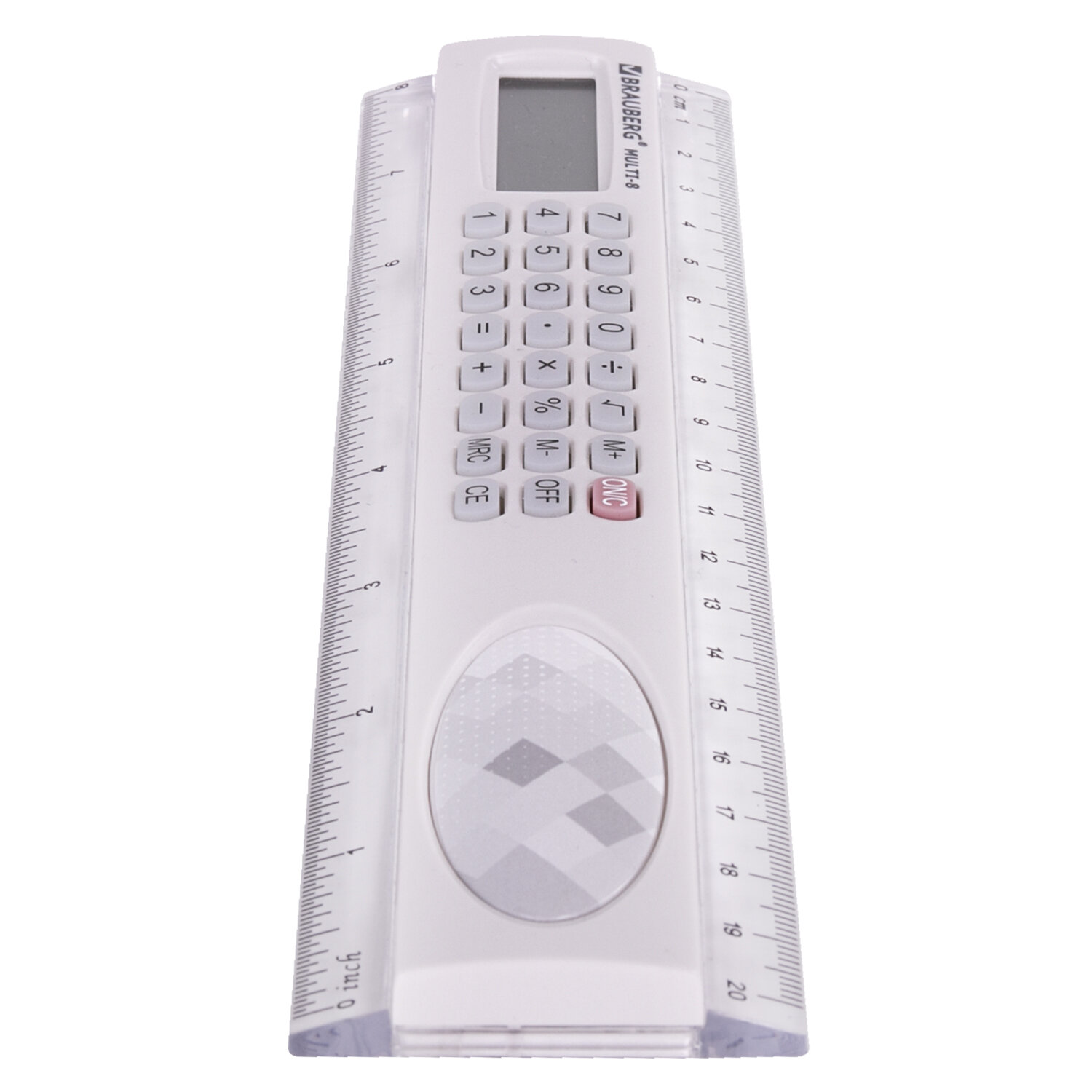Длина шкалы линейки составляет 20 см. Имеет двойную градацию (сантиметр и дюйм). Линейка обладает четкой разметкой, что делает ее удобной в использовании. Цвет: прозрачный. Калькулятор с линейкой 20 см, BRAUBERG MULTI-8 (53x210 мм), 8 разрядов, 250540