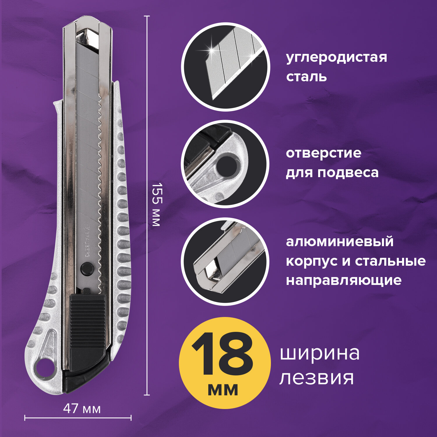 У ножа имеется надежный автоматический фиксатор длины лезвия, благодаря чему конструкция не деформируется при работе. Затупившийся конец лезвия легко удалить, отломив небольшой фрагмент. Металлический корпус серебристого цвета обеспечивает долговечность ножа, а рифленые края предотвращают соскальзывание руки при работе с инструментом. Ширина лезвия стандартная, 18 мм. Для удобства хранения имеется отверстие для подвеса. Нож продается в пластиковом блистере с европодвесом. Нож канцелярский 18 мм BRAUBERG "Metallic", металлический корпус (рифленый), автофиксатор, блистер, 235401