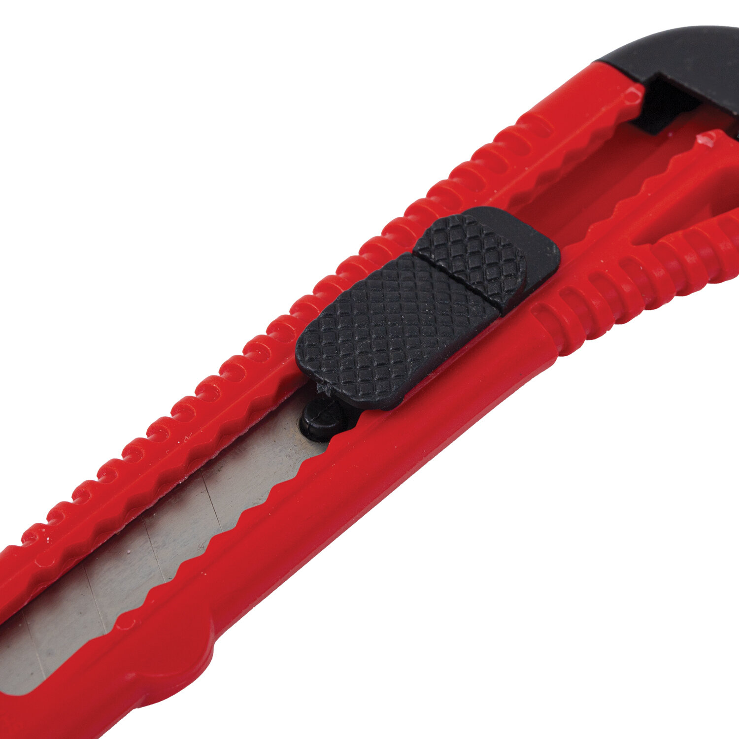 Острые лезвия шириной 18 мм из высокопрочной стали в надежном пластиковом корпусе со специальной защелкой. Защелка позволяет фиксировать лезвие в нужном положение и регулировать длину ножа. Если лезвие затупилось, достаточно выдвинуть часть, пришедшую в негодность, и обломать ее по наклонной черте, нанесенной на поверхности ножа. Имеется отверстие для подвеса.
