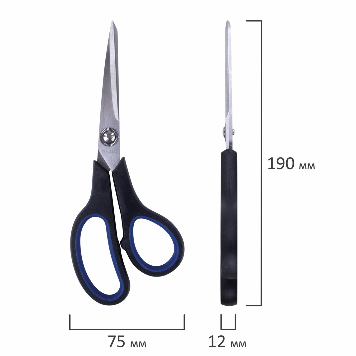 - Ножницы BRAUBERG "Soft Grip", 190 мм, черно-синие, резиновые вставки, 3-х сторонняя заточка, 230762
