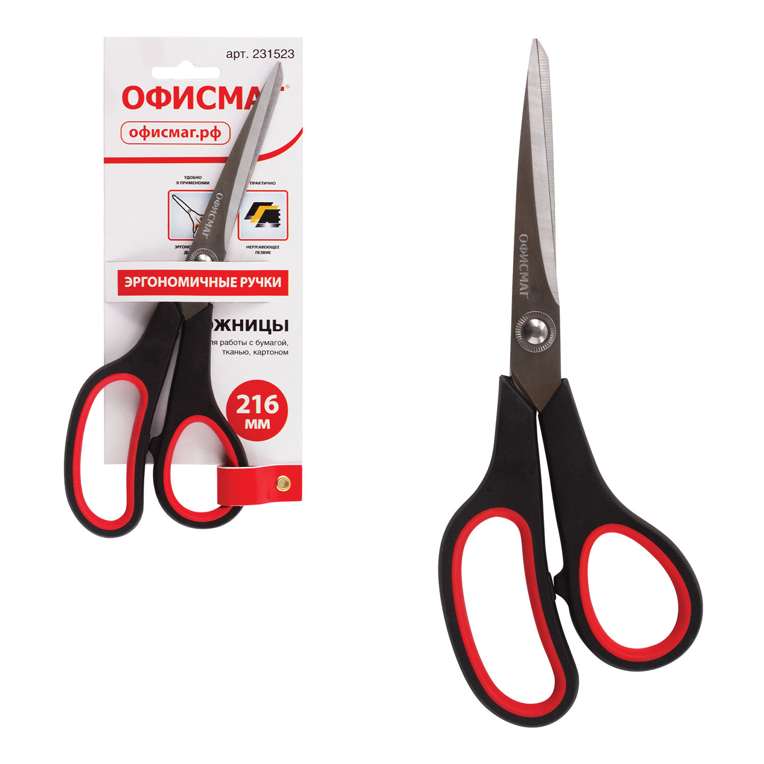 - Ножницы ОФИСМАГ "Soft Grip", 216 мм, резиновые вставки, черно-красные, 3-х сторонняя заточка, в картонная упаковка с европодвесом, 231523