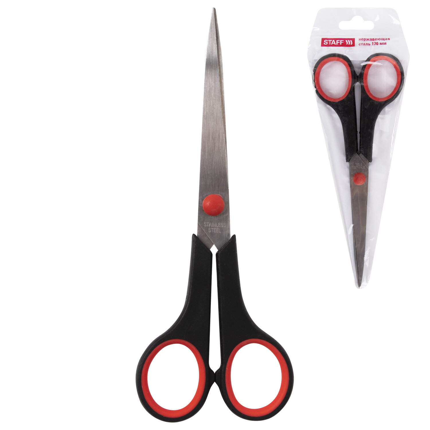 - Ножницы STAFF EVERYDAY, 170 мм, бюджет, резиновые вставки, черно-красные, ПВХ чехол, 237498