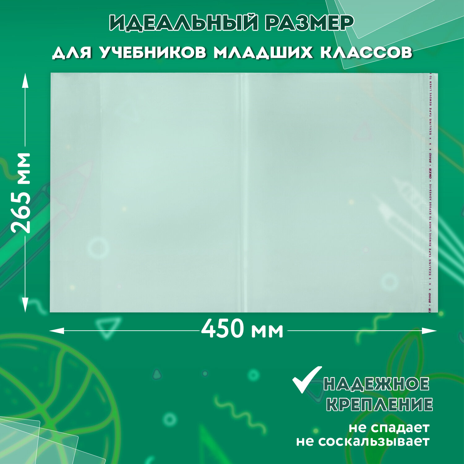 Прозрачная глянцевая плотная обложка для учебников младших классов изготовлена из полипропилена (ПП) толщиной 70 мкм. Благодаря КЛЕЙКОМУ КРАЮ обложка легко регулируется по ширине. Размер - 265х450 мм. С индивидуальным штрих-кодом. В комплекте 5 штук. Обложки ПП для учебников младших классов БОЛЬШО ФОРМАТА, КОМПЛЕКТ 5 шт., КЛЕЙКИЙ КРАЙ, 70 мкм, 265х450 мм, прозрачные, ПИФАГОР, 227415