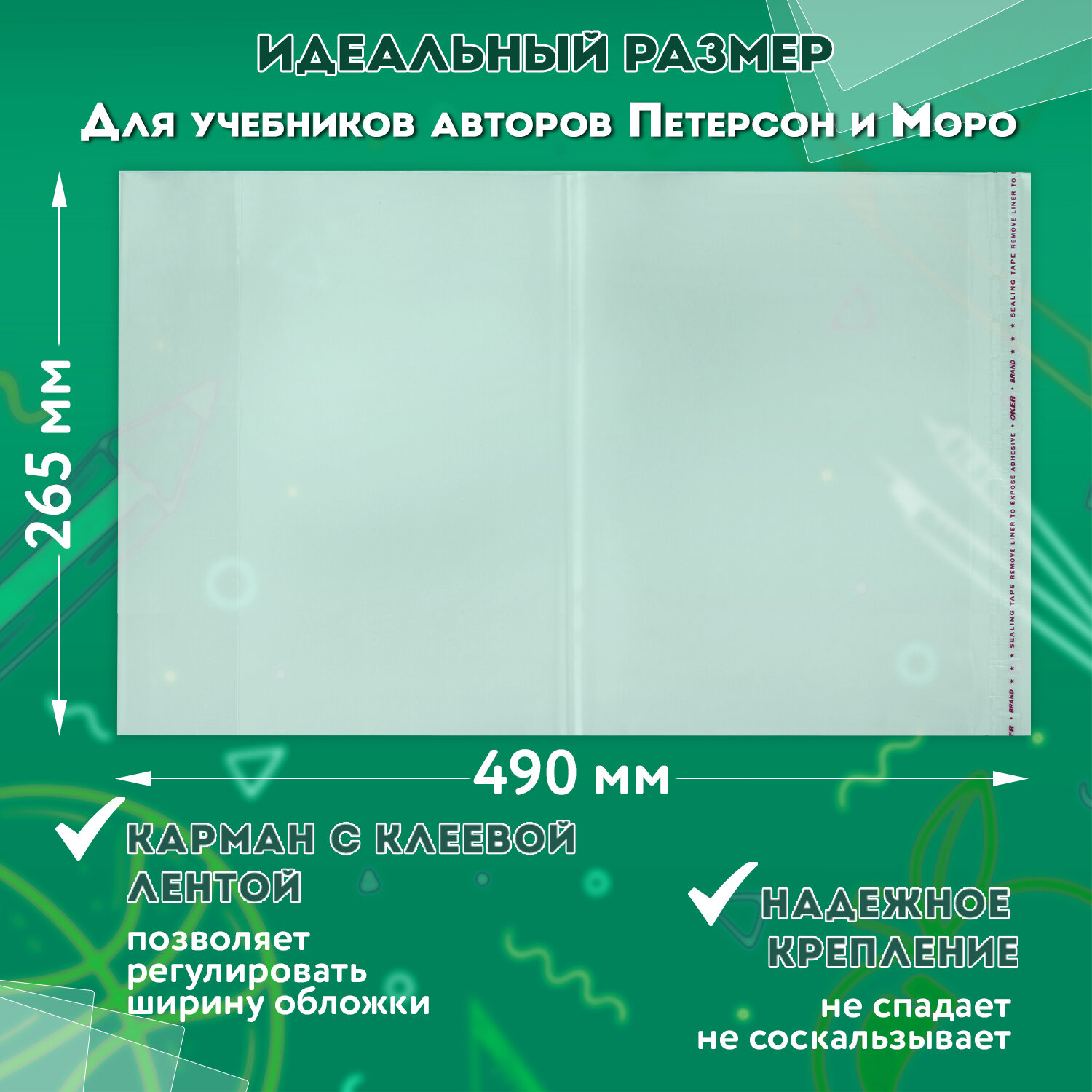 - Обложки ПП для учебников Петерсон, Моро, КОМПЛЕКТ 5 шт., КЛЕЙКИЙ КРАЙ, 80 мкм, 265х490 мм, прозрачные, ПИФАГОР, 229357