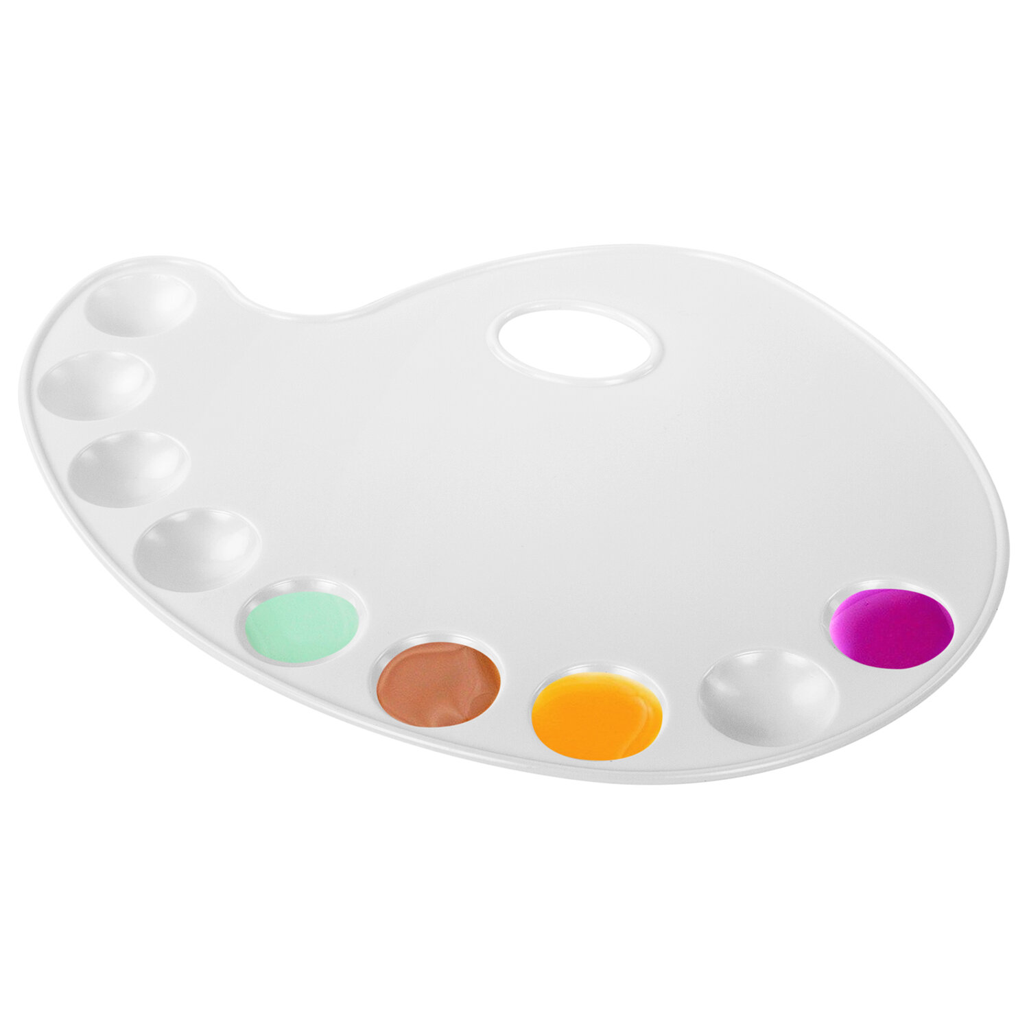 Легкая и компактная пластиковая палитра подходит для работы со всеми типами художественных красок: масляными, акриловыми, темперными, гуашевыми, акварельными. Имеет 9 ячеек для смешивания красок. Палитру овальной формы удобно держать в руке. Размеры - 28х21 см.