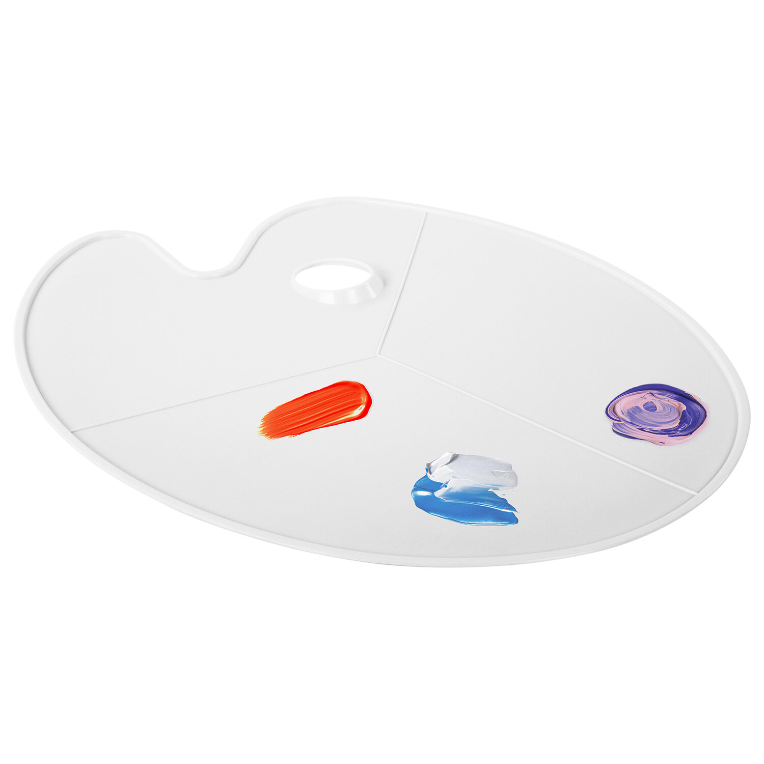 Большая и легкая пластиковая палитра подходит для работы со всеми типами художественных красок: масляными, акриловыми, темперными, гуашевыми, акварельными. Ее ровная поверхность разделена на три секции, бортики которых не позволят краскам растекаться. Палитру овальной формы удобно держать в руке.