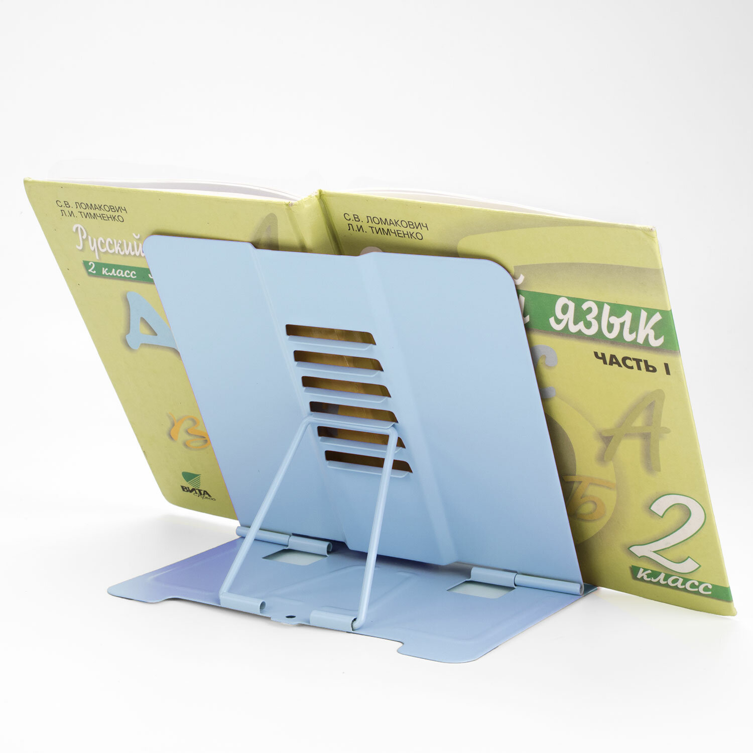 Подставка полностью изготовлена из металла, поэтому отлично подойдет для надежной фиксации тяжелых и объемных учебных материалов и книг. Оригинальный дизайн понравится как младшим школьникам, так и школьникам среднего звена. Регулируемый угол наклона обеспечивает удобство при работе с текстом, облегчает чтение и подготовку домашней работы. Размер подставки – 20х18,5 см. Цвет – голубой. Подставка для книг и учебников ЮНЛАНДИЯ "Lama", регулируемый наклон, металлическая, 237576