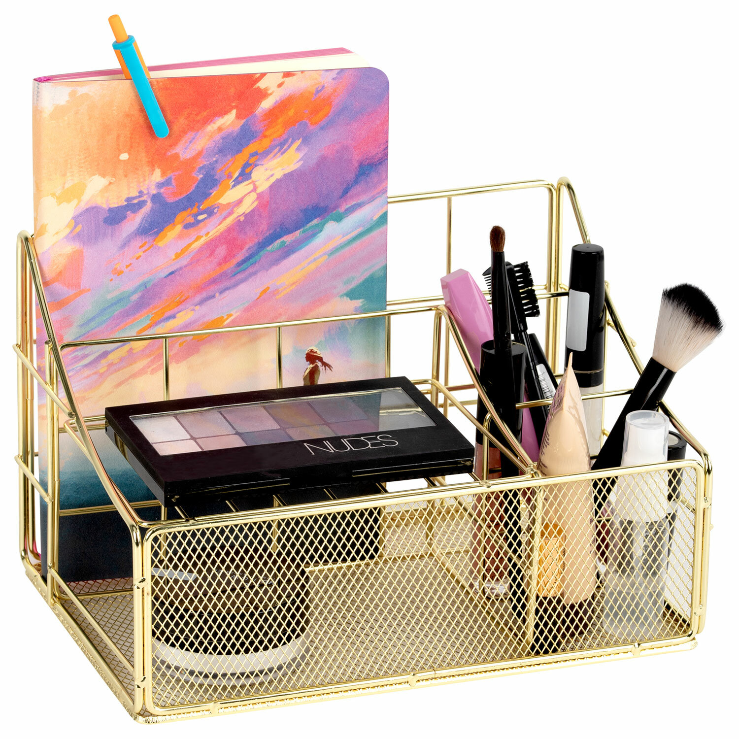 Изготовлен из металлической сетки. Имеет размеры 160х240х150 мм. Состоит из четырех секций. Благодаря своему стильному дизайну, удобству использования и надёжности, органайзер MONTE VITA станет незаменимым аксессуаром для вашего комфорта. Он обеспечит удобное хранение вашей канцелярии, косметики и прочих мелочей, а также лёгкий доступ к ним. Органайзер для косметики и мелочей металлический 4 секции, MONTE VITA, 160х240х150 мм, золото, 272479