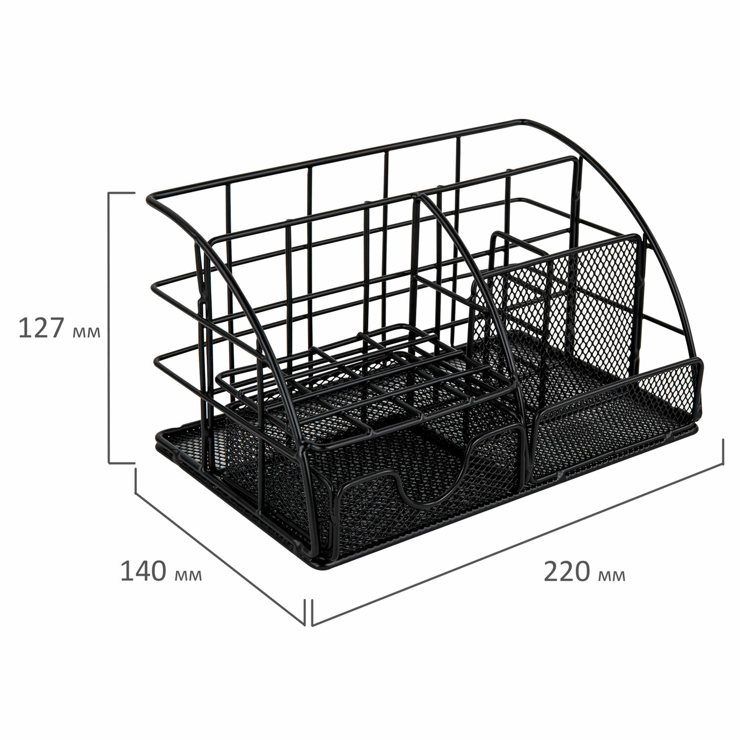 Изготовлен из металлической сетки. Имеет размеры 140х220х127 мм. Состоит из пяти секций. Благодаря своему стильному дизайну, удобству использования и надежности, органайзер MONTE VITA станет незаменимым аксессуаром для вашего комфорта. Он обеспечит удобное хранение вашей канцелярии, косметики и прочих мелочей, а также легкий доступ к ним. Органайзер для косметики и мелочей металлический 5 секций, MONTE VITA, 140х220х127 мм, чёрный, 272478