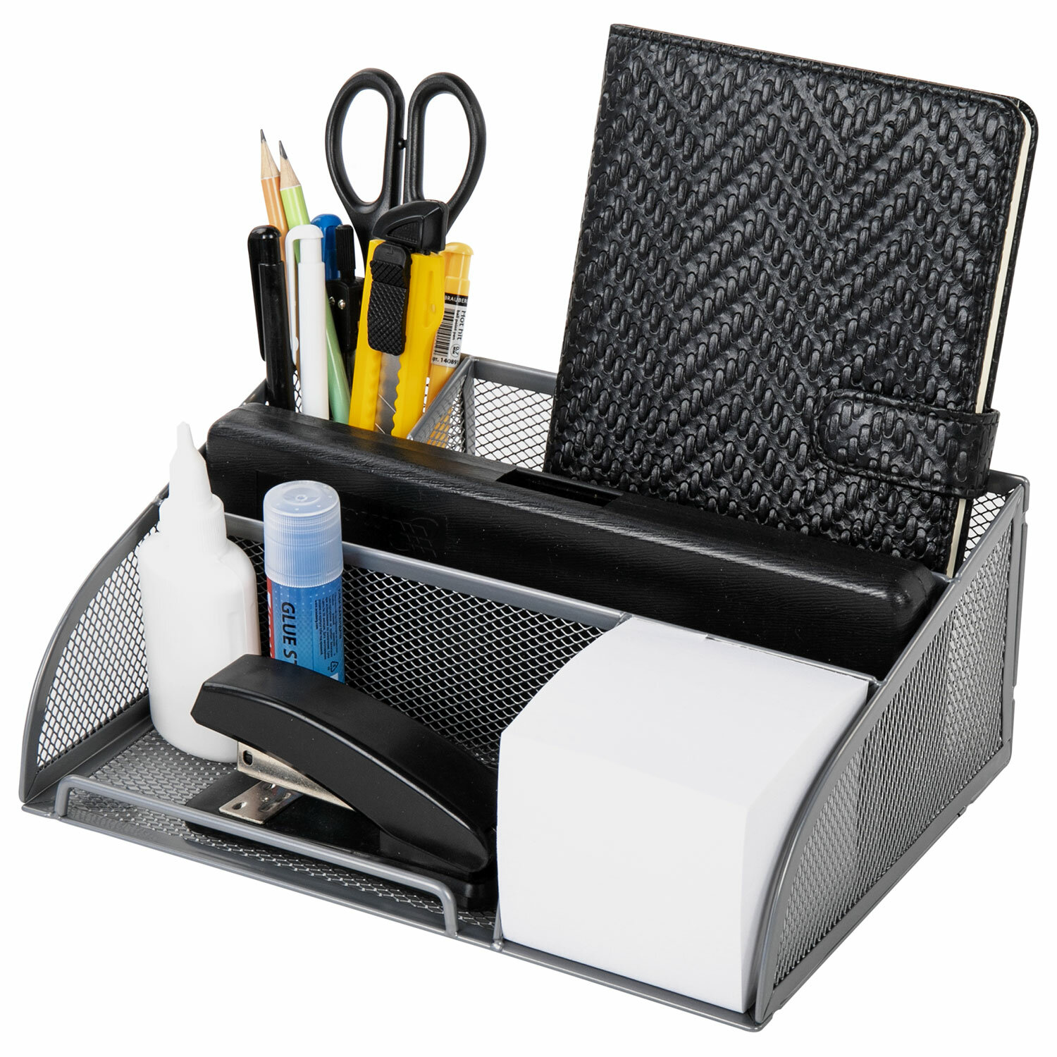 Изготовлена из металлической сетки. Имеет размеры 255х180х105 мм. Состоит из 5 отделений для пишущих принадлежностей и канцелярских мелочей. Мягкие подушечки на дне предотвращают скольжение и порчу мебели. Подставка-органайзер упакована в фирменную коробку. Поставляется без канцелярского наполнения. Подставка-органайзер BRAUBERG "Germanium", 5 секций, 255х180х105 мм, металл, серебро, 237974