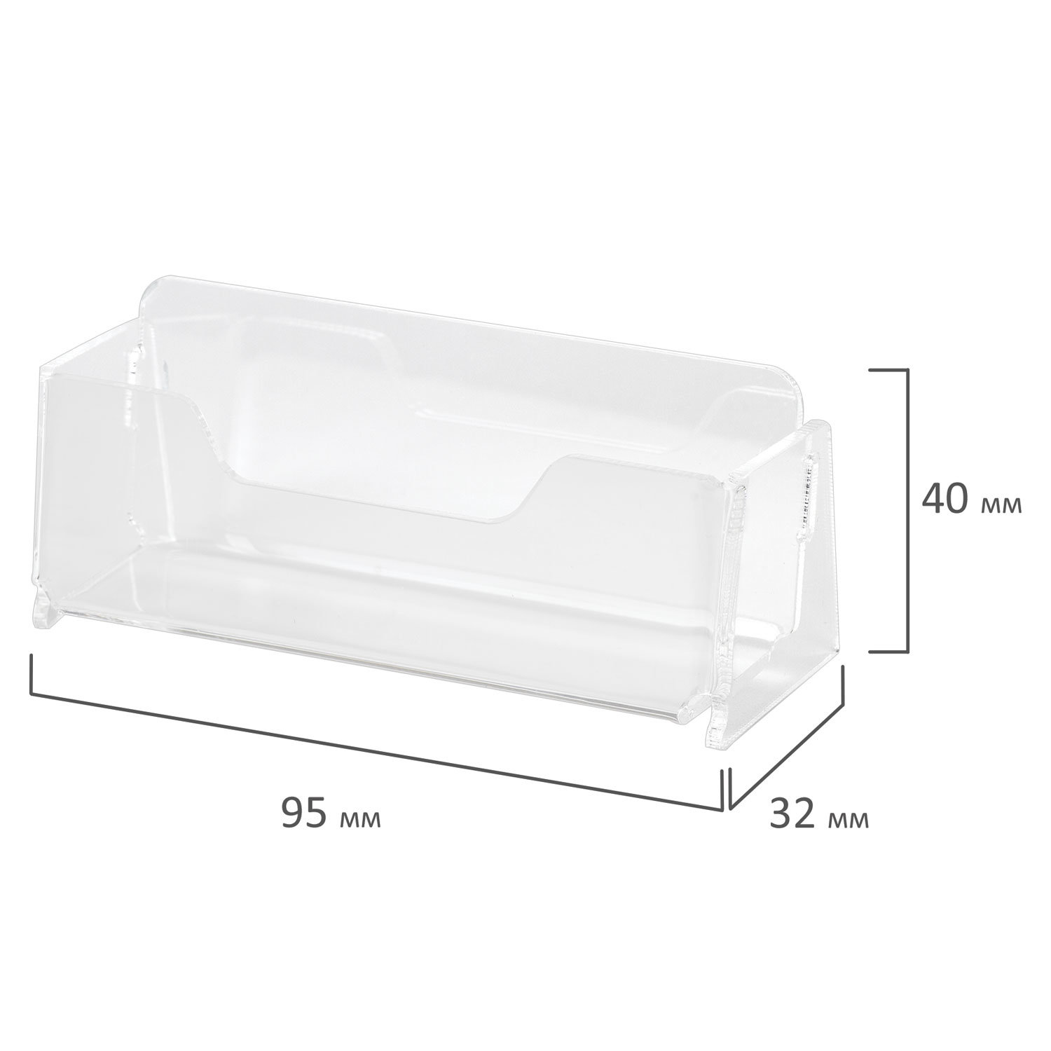Изготовлена из прозрачного оргстекла. Имеет одно отделение, способное вместить 40 визиток шириной 95 мм. Размер - 40х95х32 мм. Поставляется в картонной коробке. Подставка для визиток настольная BRAUBERG, 95х40 мм, 1 карман глубиной 32 мм, 290420