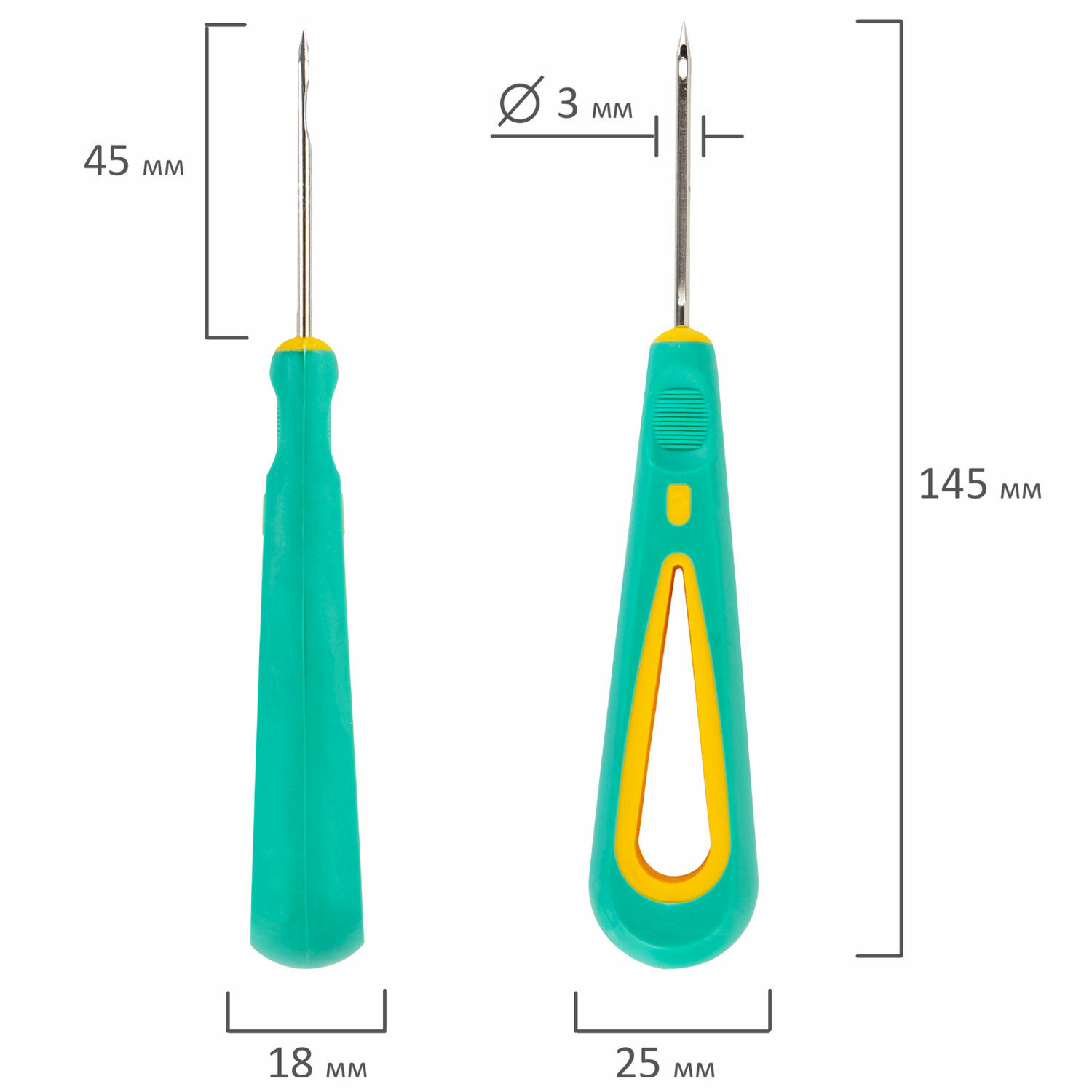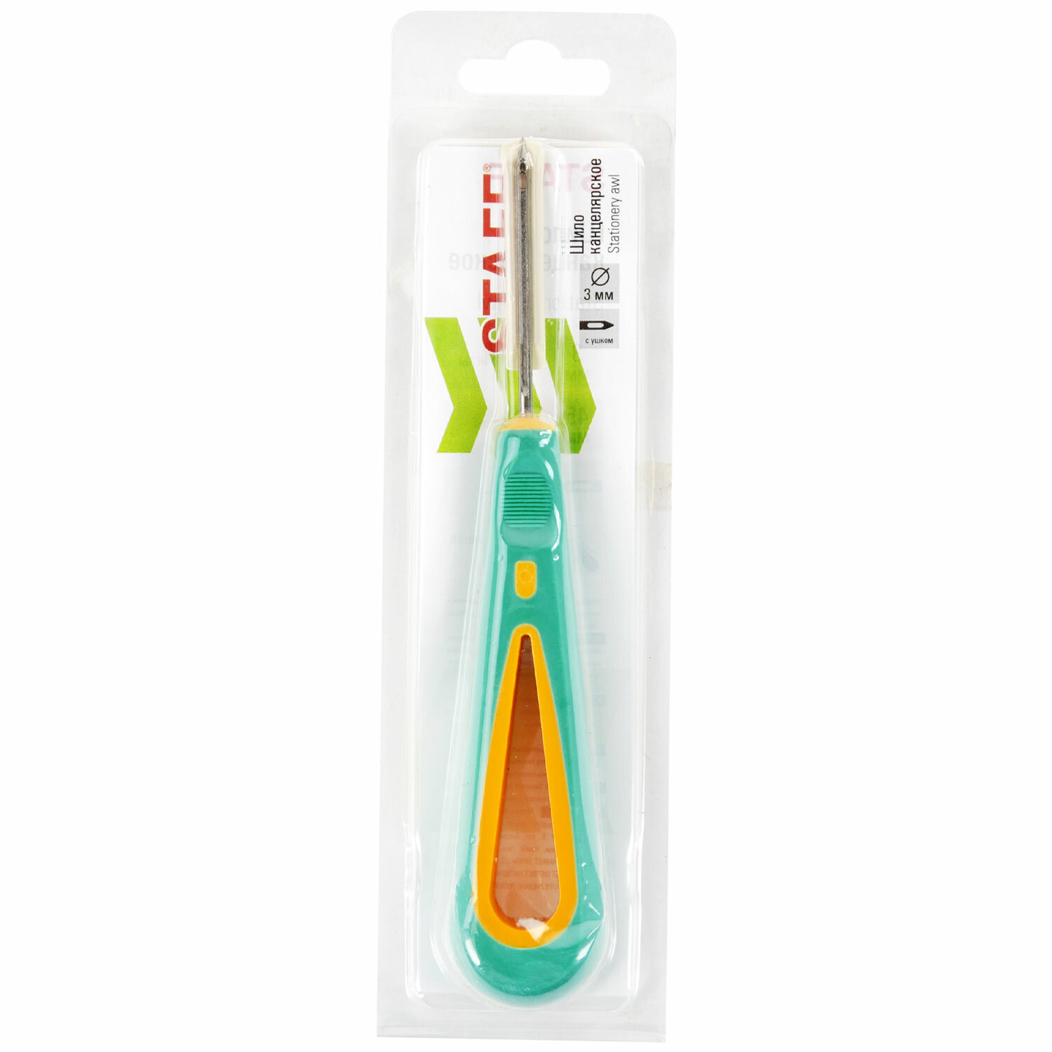 Игла с ушком диаметром 3 мм и длиной 4,5 см из стали с пластиковой цветной рукояткой. Шило обеспечивает прокалывание до 30 листов бумаги. Поставляется в блистере с подвесом. Шило с ушком, общая длина 145 мм, d=3 мм, прорезиненная ручка, STAFF, 238114