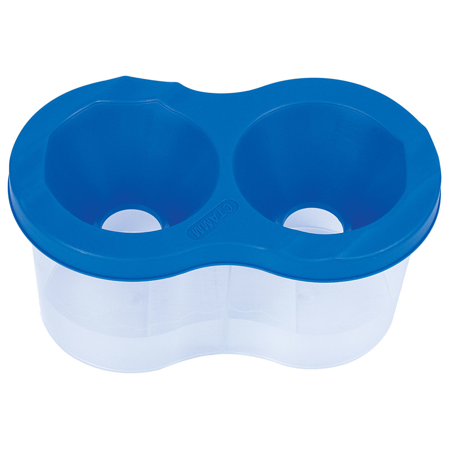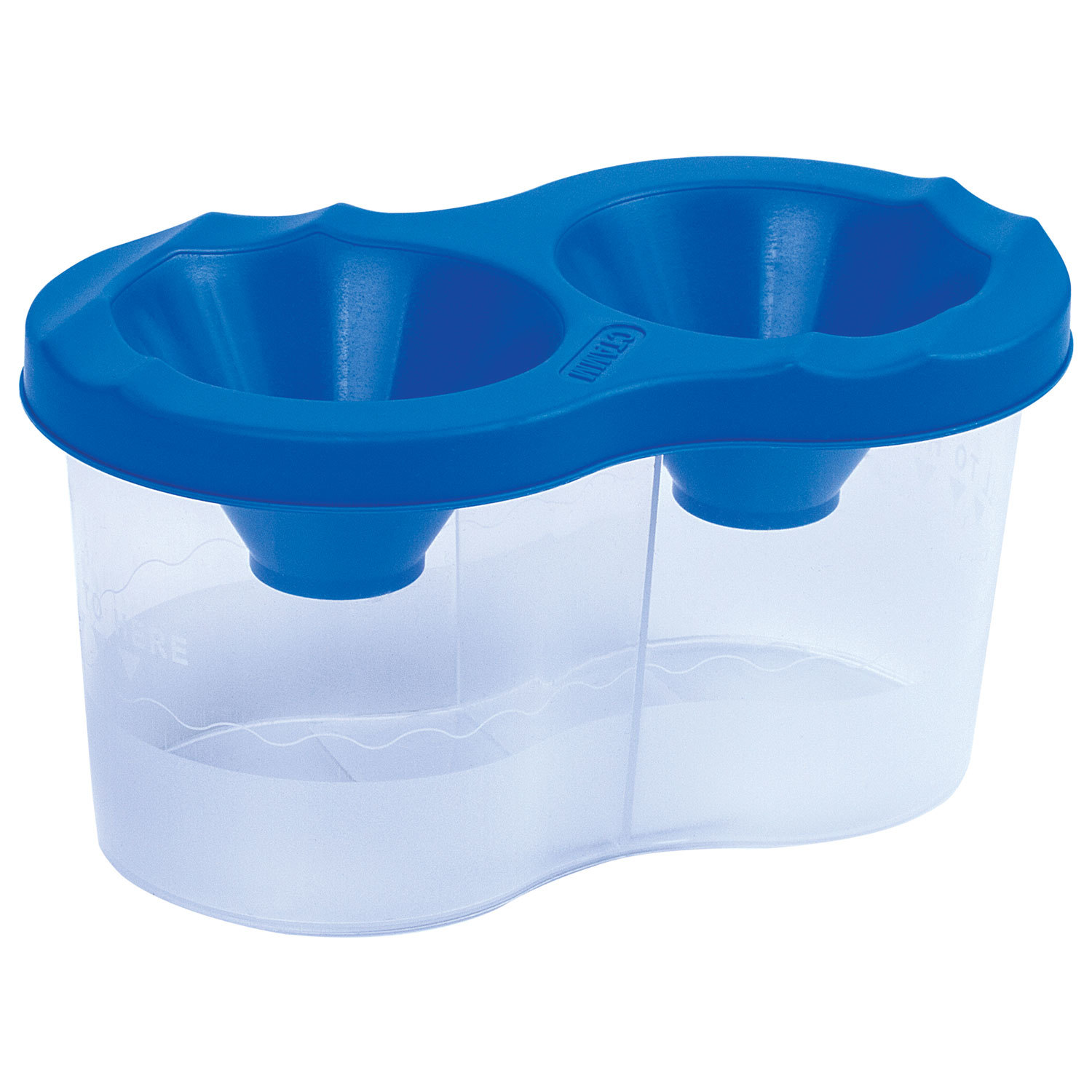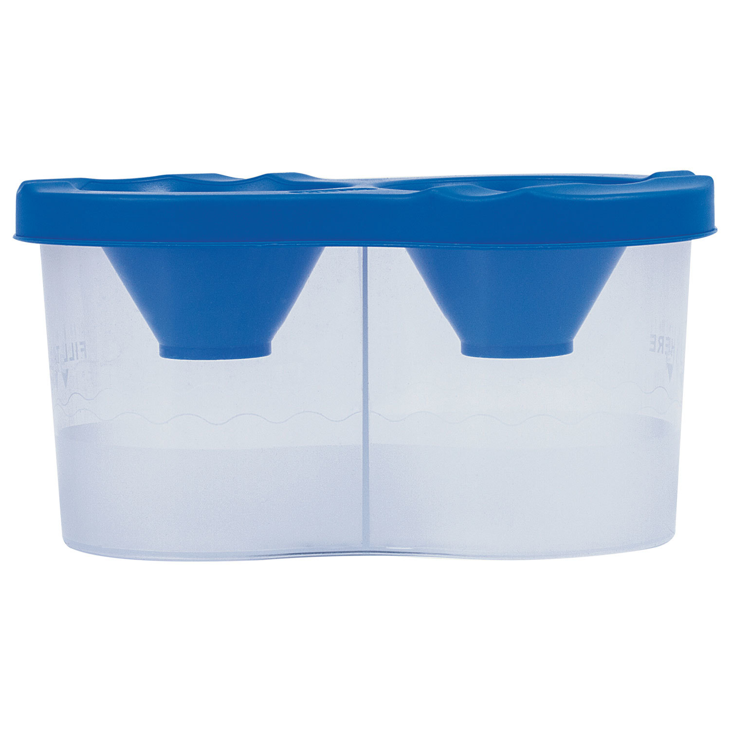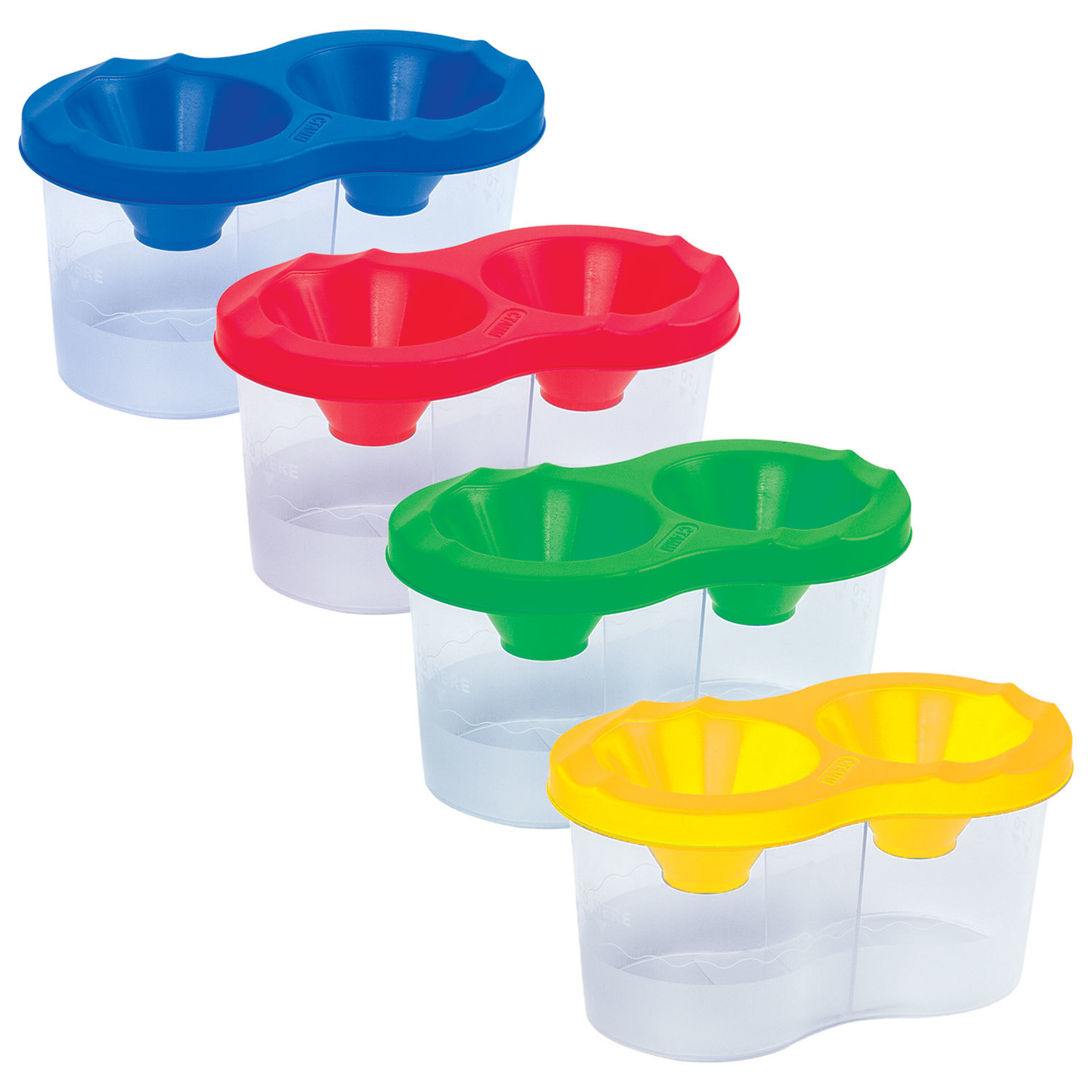 Имеет 2 вместительных резервуара для воды. Специальная форма крышки стакана исключает возможность вытекания воды. Линия на прозрачном корпусе указывает на максимально возможный уровень наполнения. Выполнен из прочного пластика. Имеются специальные углубления на крышке для размещения кисточек. Полный объем одного отделения - 150 мл. Объем до уровня - 50 мл.
