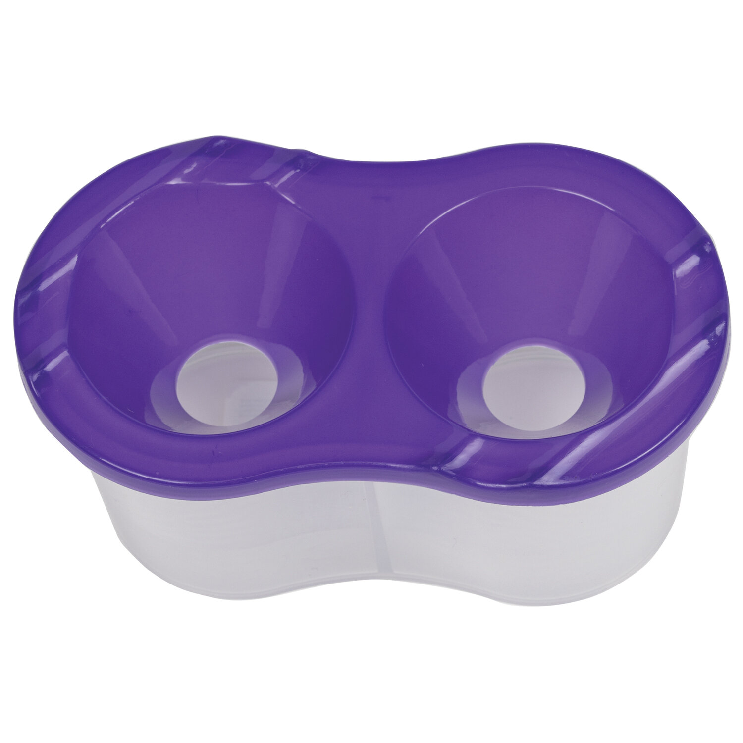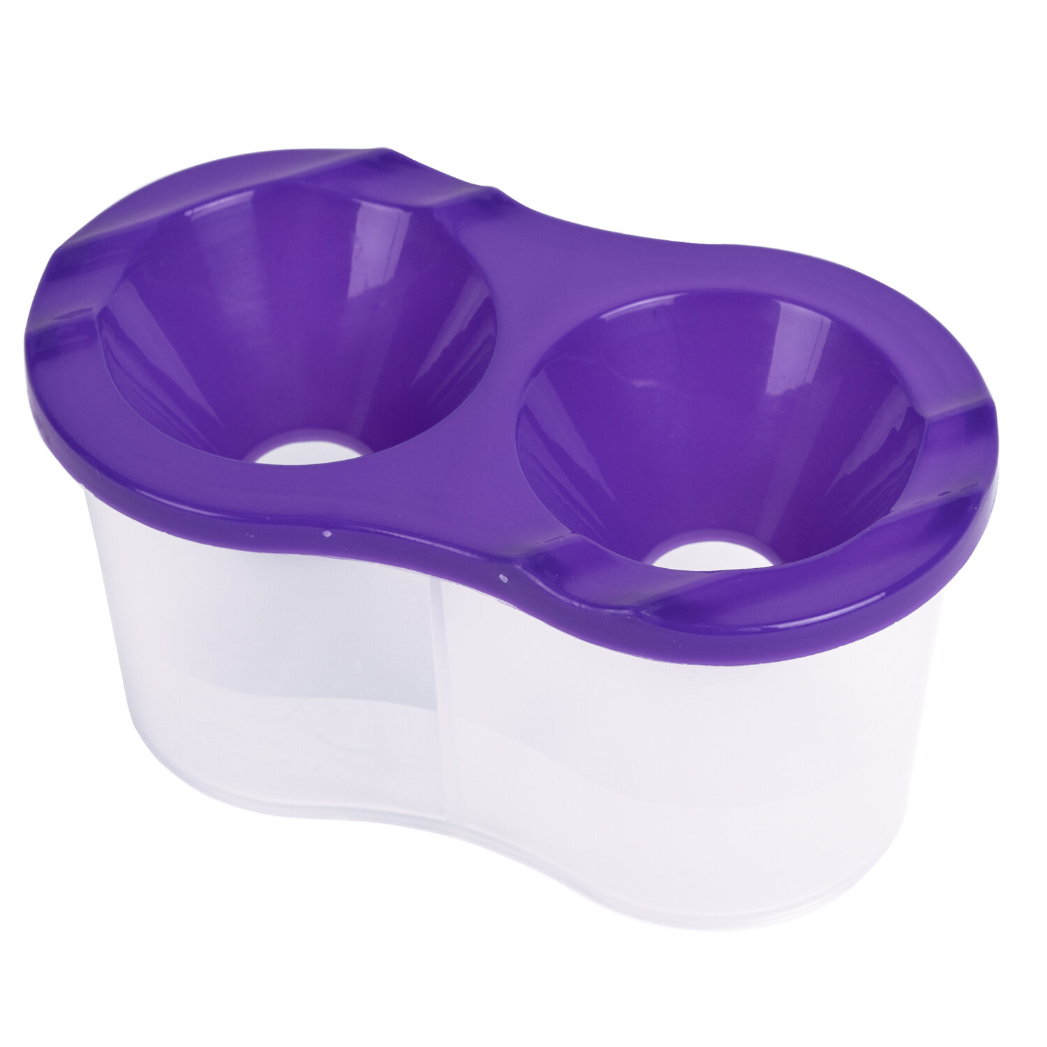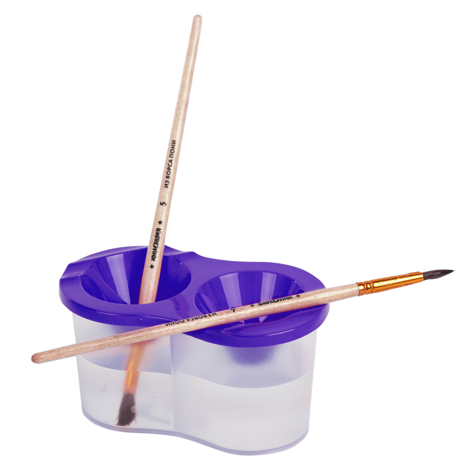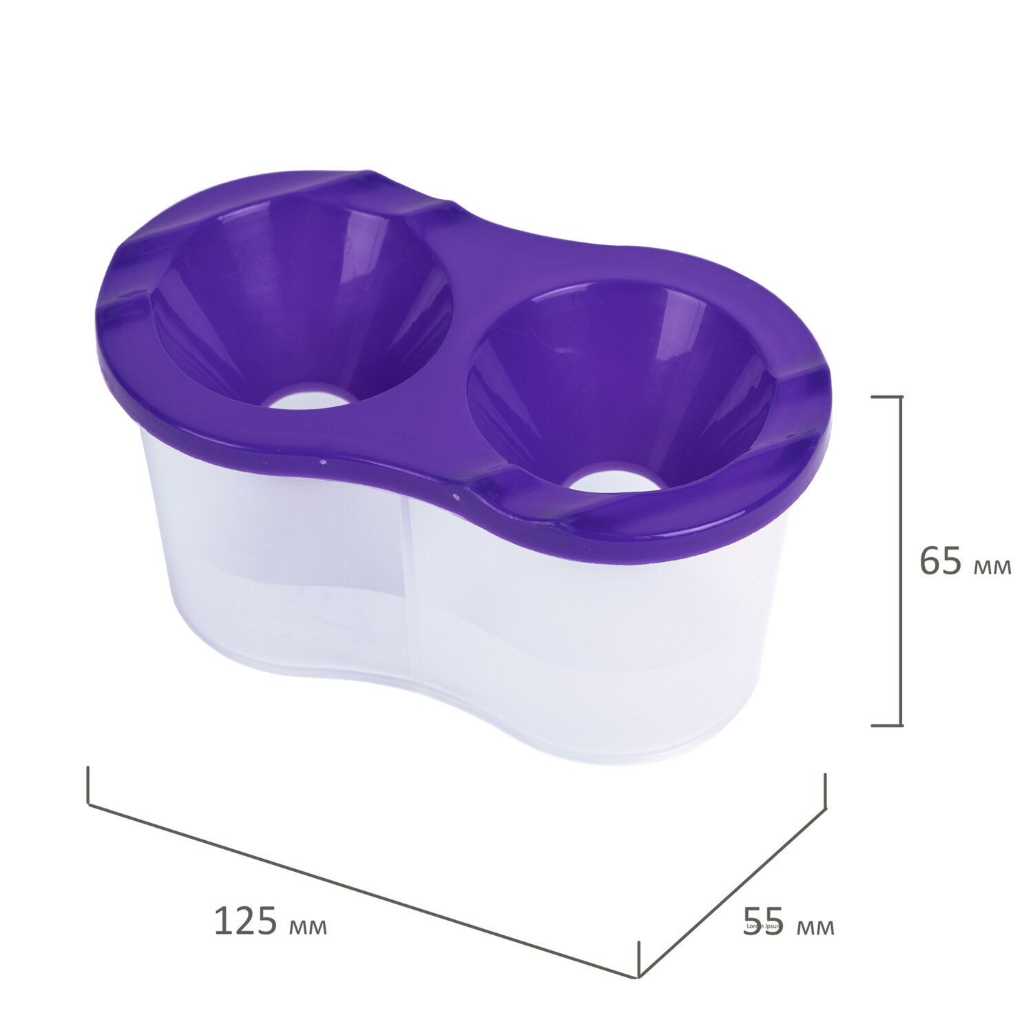 Стакан выполнен из прочного пластика и имеет 2 вместительных резервуара для воды. Линия на прозрачном корпусе указывает на максимально возможный уровень наполнения. Специальная форма крышки стакана исключает возможность вытекания воды. На крышке имеются углубления для размещения кисточек. Полный объем одного отделения - 150 мл. Объем до уровня наполнения - 50 мл.