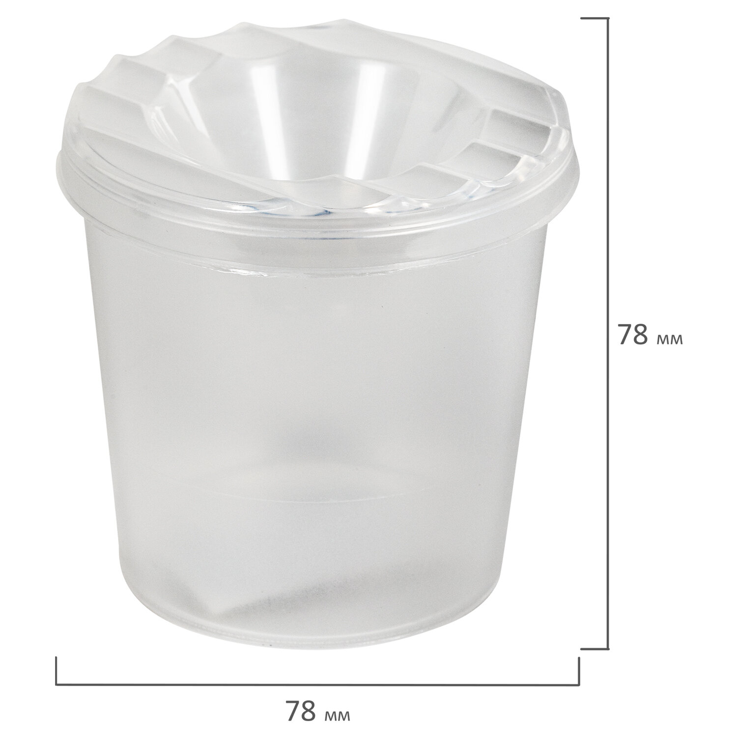 Стакан выполнен из прочного пластика. Линия на прозрачном корпусе указывает на максимально возможный уровень наполнения. Специальная форма крышки стакана исключает возможность вытекания воды. На крышке имеются углубления для размещения кисточек. Полный объем - 210 мл. Объем до уровня наполнения - 75 мл. Стакан-непроливайка ПИФАГОР "ЭНИКИ-БЕНИКИ", прозрачный, 192127