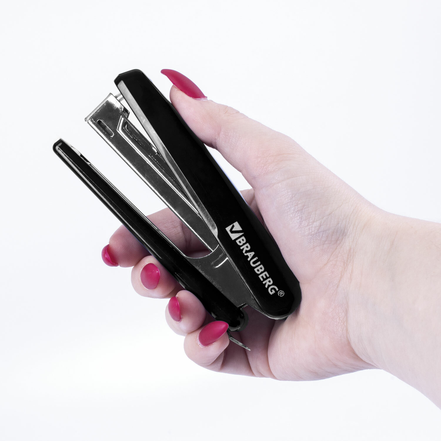 Настольный степлер BRAUBERG t;Classict; с антистеплером в черном пластиковом корпусе с металлическим механизмом cпособен скрепить до 12 листов. Подходящий размер скоб № 10. Виды сшивания: закрытый, прямой. Глубина закладки бумаги - 64 мм. Габариты: высота - 45 мм, ширина - 25 мм, длина - 110 мм. Благодаря компактным размерам удобен в использовании и занимает мало места на рабочем столе, а классический дизайн делает степлер подходящим к любому интерьеру. Продается в картонной упаковке. Степлер №10 BRAUBERG "Classic", до 12 листов, с антистеплером, черный, 222545