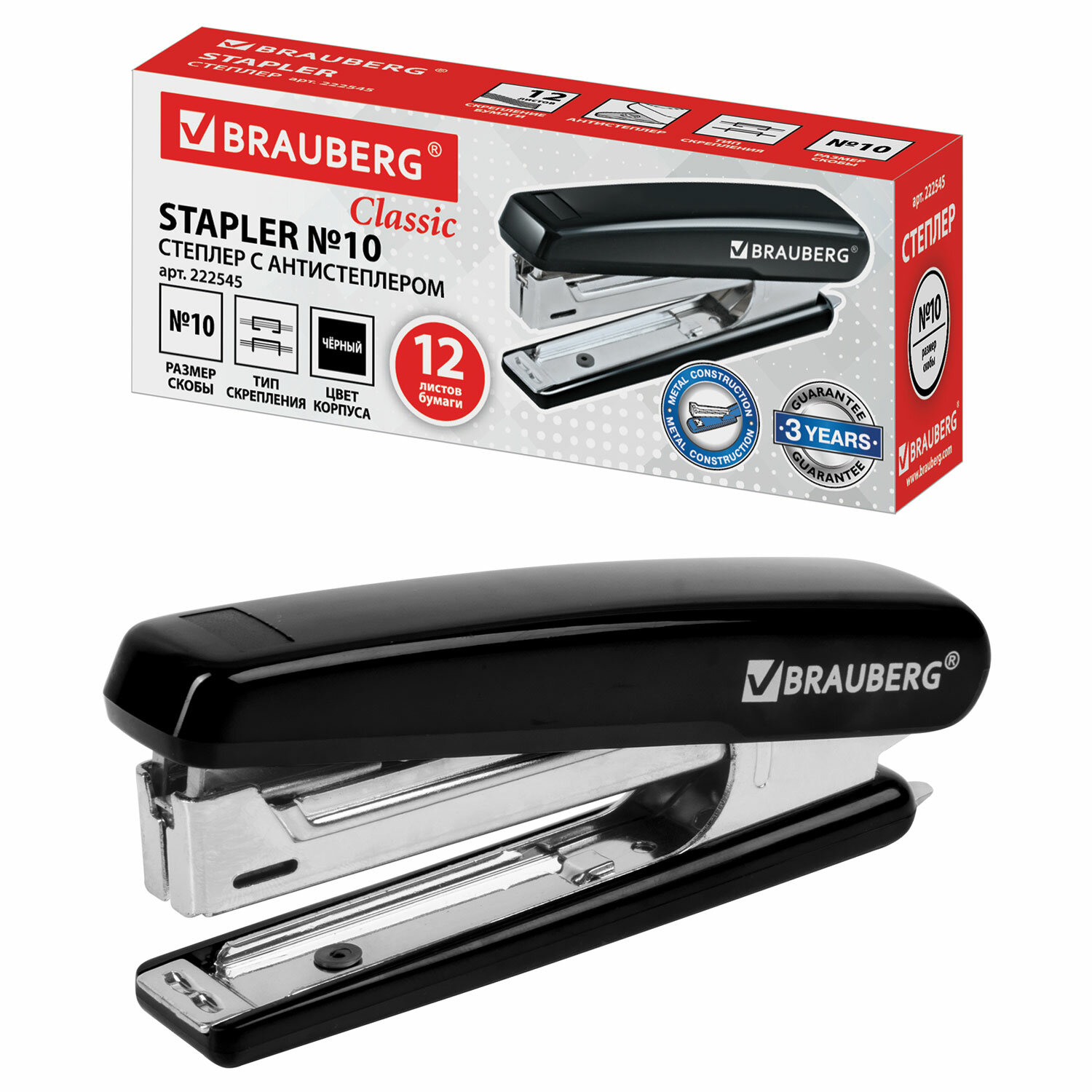 - Степлер №10 BRAUBERG "Classic", до 12 листов, с антистеплером, черный, 222545
