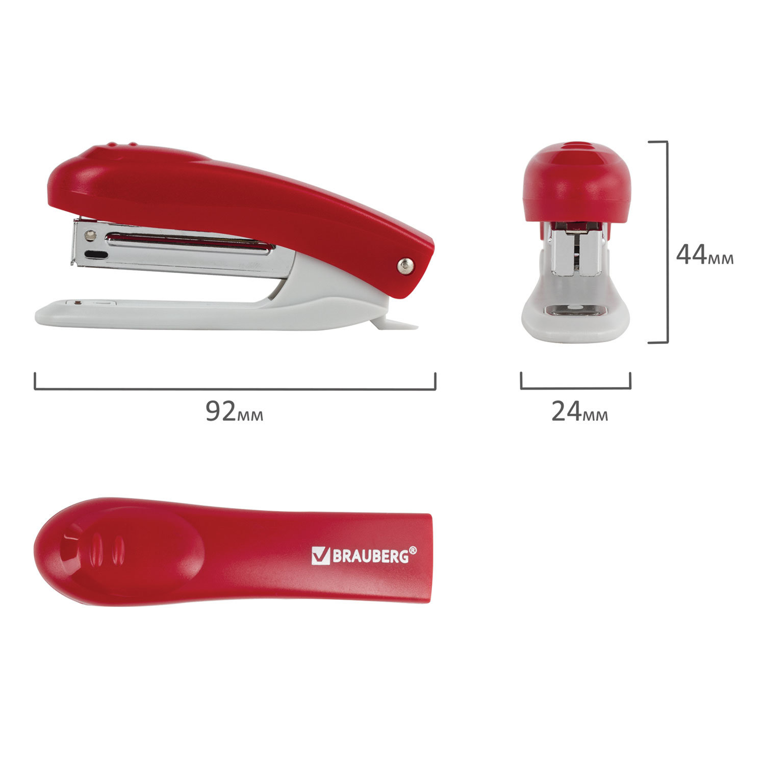 Настольный степлер BRAUBERG t;Originalt; с антистеплером в красном пластиковом корпусе с металлическим механизмом cпособен скрепить до 12 листов. Подходящий размер скоб № 10. Виды сшивания: закрытый, прямой. Глубина закладки бумаги - 47 мм. Габариты: высота - 44 мм, ширина - 24 мм, длина - 92 мм. Благодаря компактным размерам удобен в использовании и занимает мало места на рабочем столе, а классический дизайн делает степлер подходящим к любому интерьеру. Продается в картонной упаковке. Степлер №10 BRAUBERG "Original", до 12 листов, с антистеплером, красный, 222532